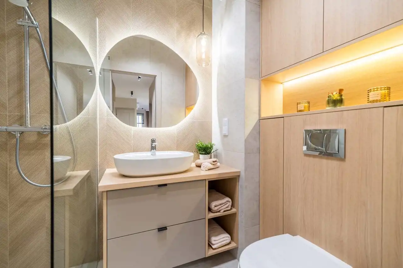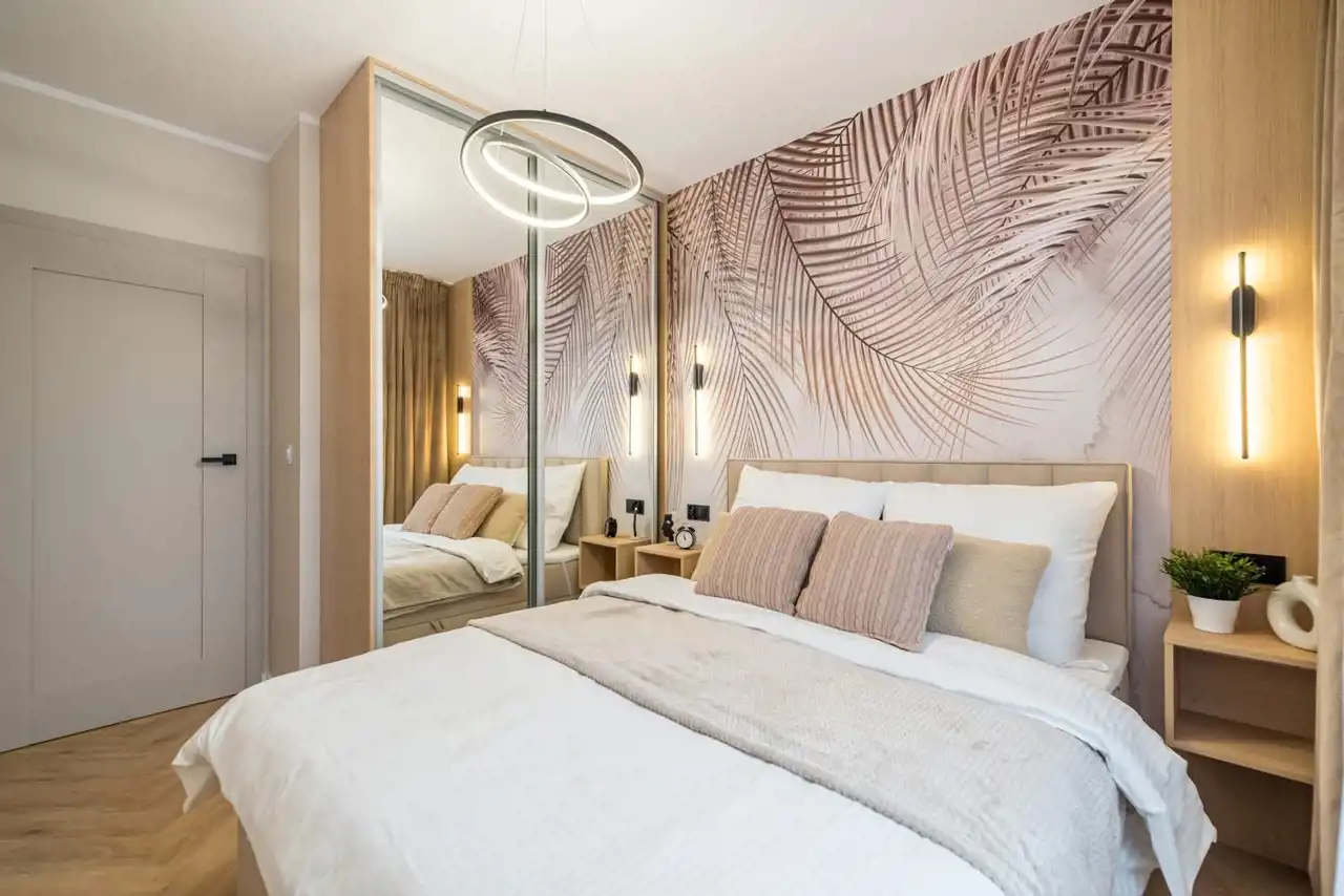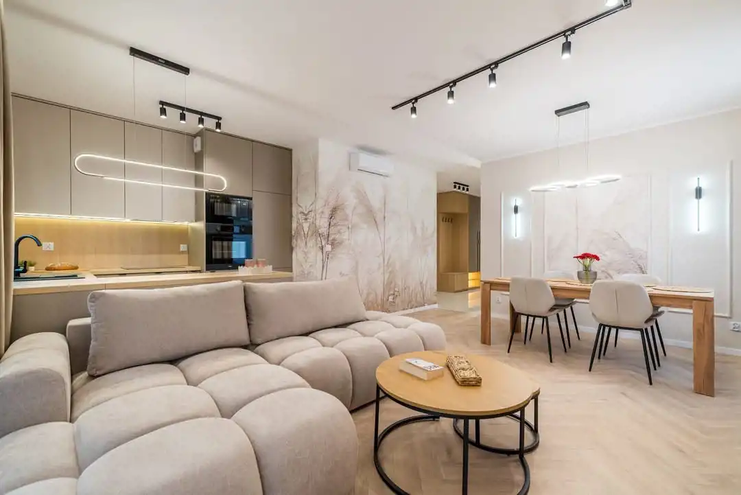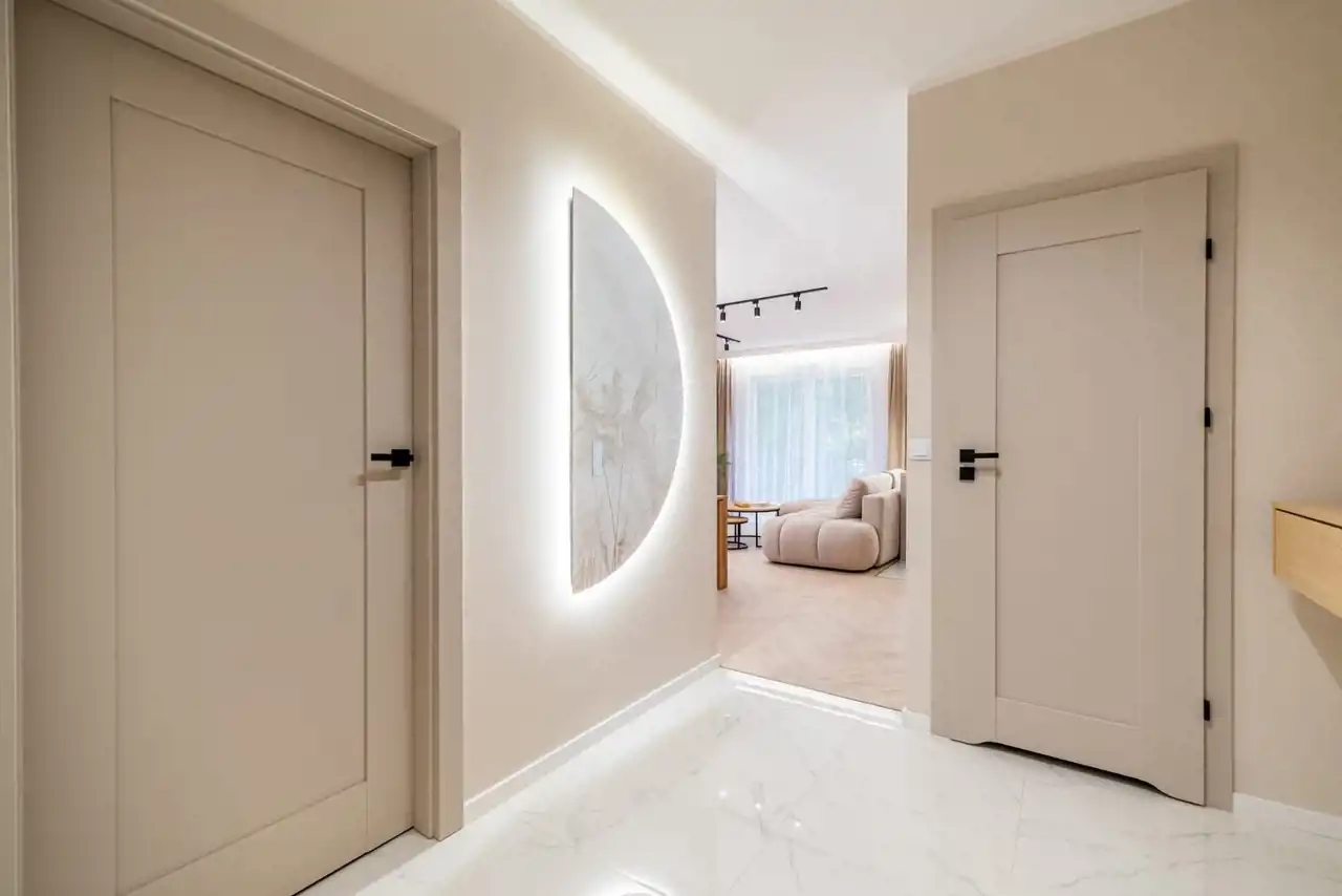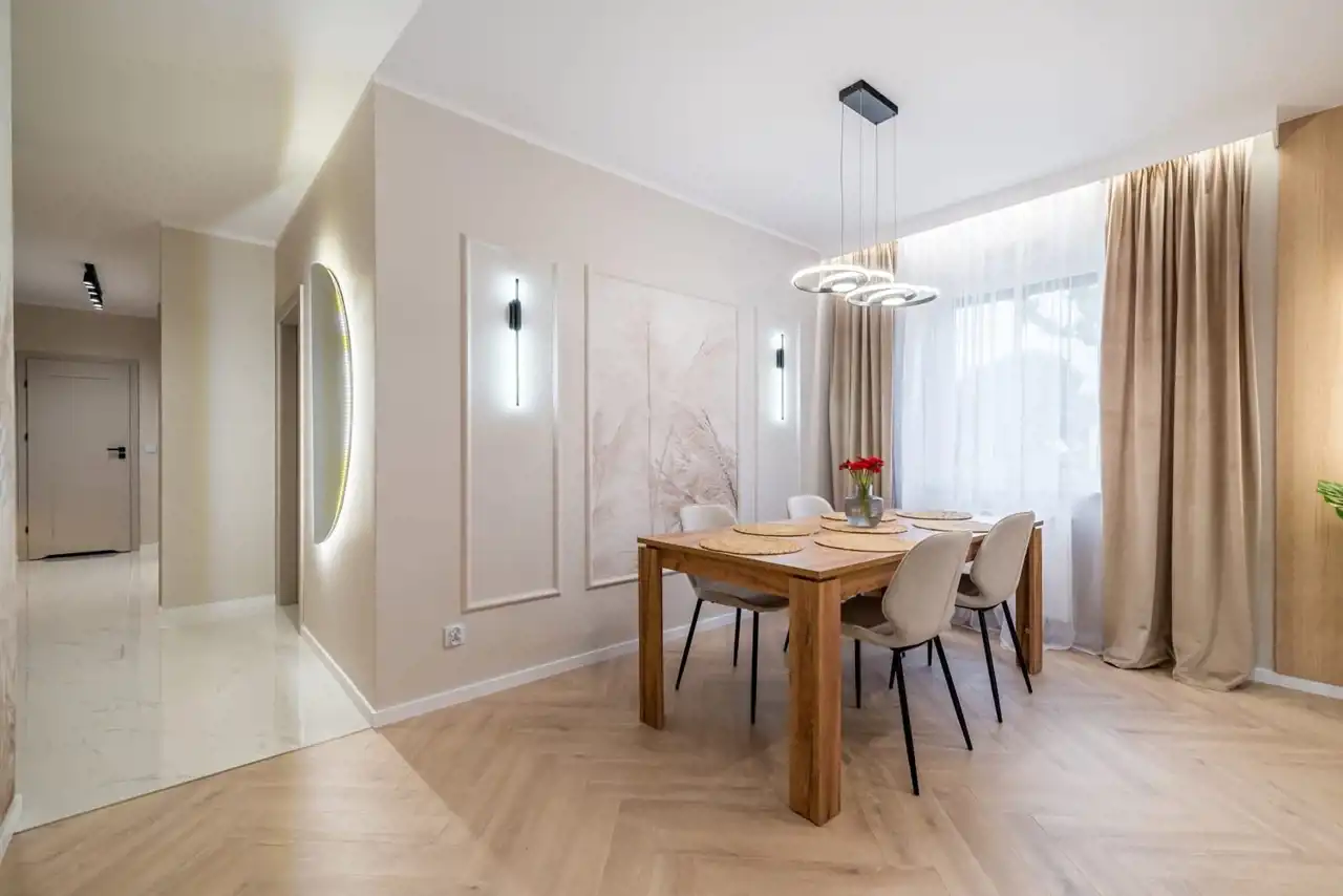 Dobrze przemyślane oświetlenie, miękkie tkaniny i wysokiej jakości materiały budują przyjazną i komfortową atmosferę. Nowoczesna łazienka z elegancką armaturą i jasną ceramiką łączy prostotę z ponadczasową klasą. Przedpokój z dużymi lustrami i zabudową meblową zwiększa funkcjonalność wnętrza.