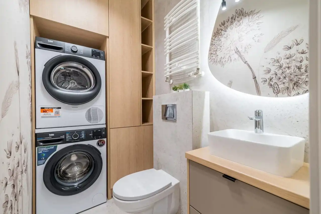 - łazienkę połączoną z pralnią, wyposażoną w zabudowę stolarską, pralkę oraz suszarkę,