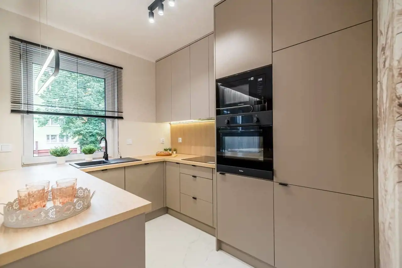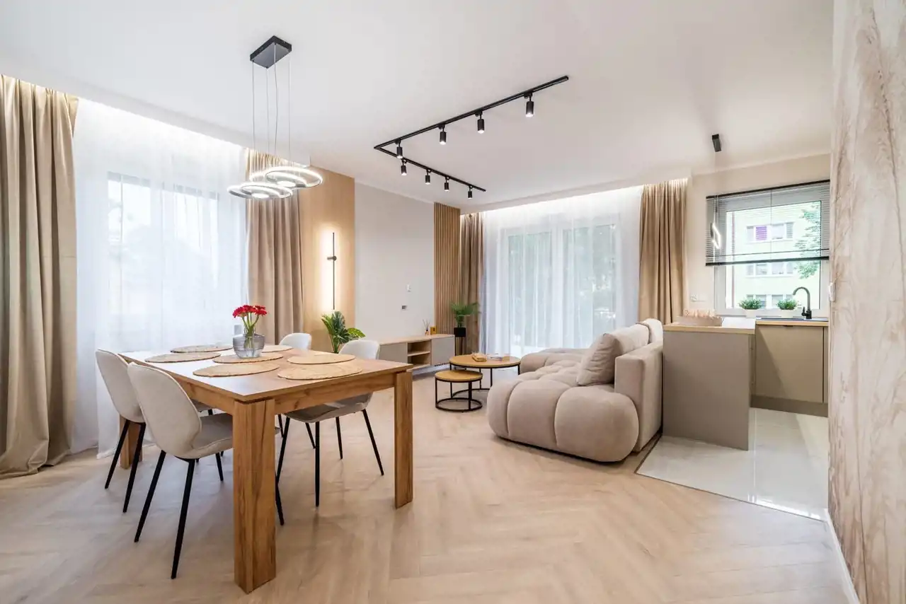 Wnętrza zostały zaprojektowane z dbałością o estetykę i funkcjonalność. Dominuje tu jasna kolorystyka, naturalne drewno i nowoczesne akcenty w ciemniejszych tonach, które tworzą elegancką i spójną przestrzeń. Kuchnia harmonijnie łączy się z jadalnią i salonem, tworząc wygodną część dzienną – idealną zarówno na codzienne posiłki, jak i spotkania z rodziną czy przyjaciółmi.