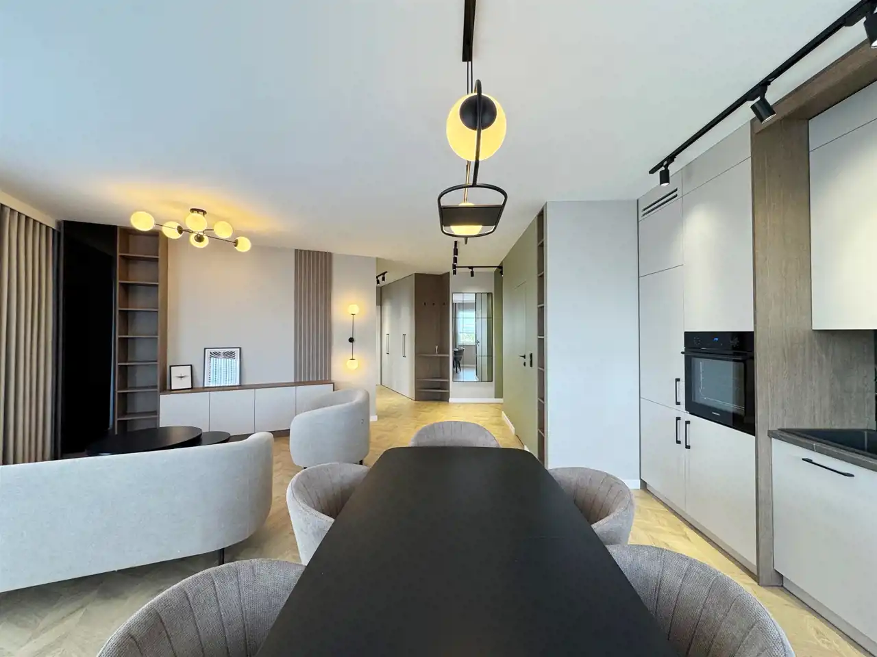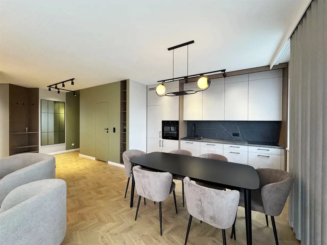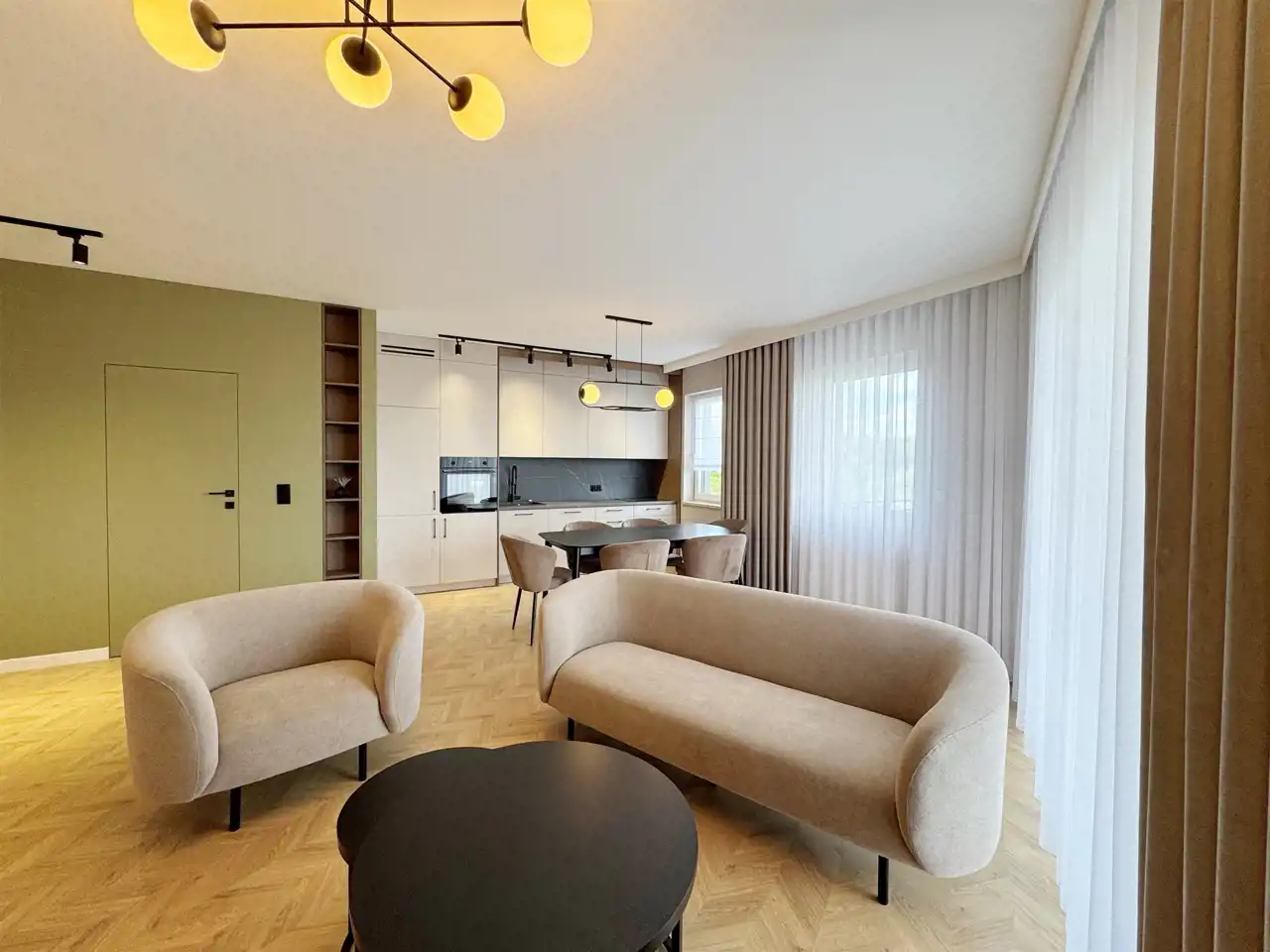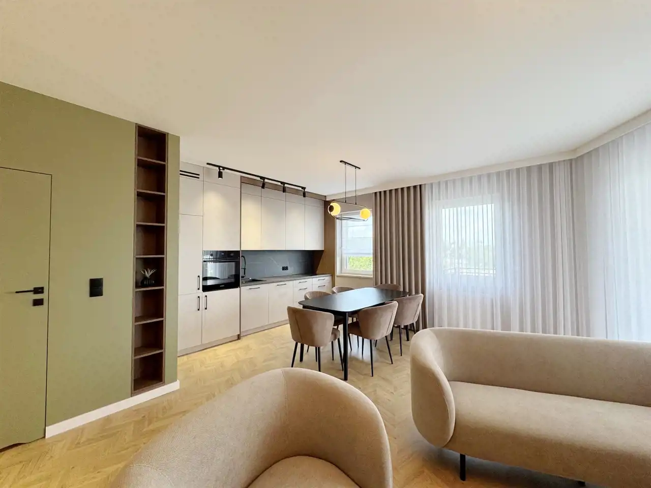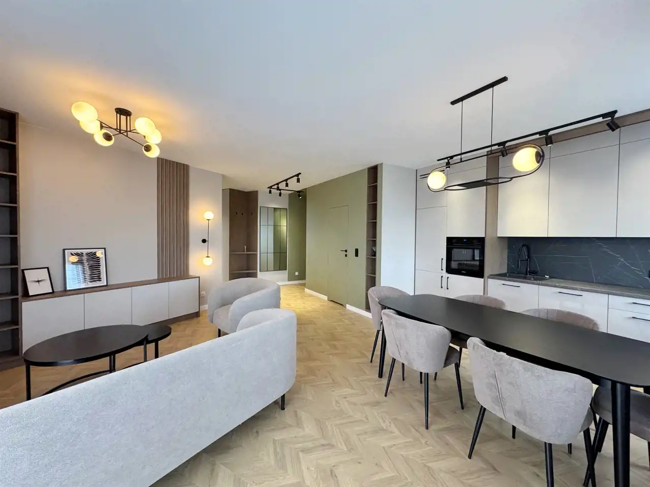 Całość uzupełniają designerskie lampy, które wieczorami tworzą nastrojową atmosferę, oraz starannie zaprojektowane zabudowy stolarskie – od pojemnych szaf w korytarzu po stylowe półki i szafki w salonie. Sercem mieszkania jest elegancka kuchnia z nowoczesną zabudową i sprzętem AGD, utrzymana w jasnych tonach z czarnymi detalami, która idealnie komponuje się z przyjemnymi, zielonymi akcentami na ścianach – wprowadzającymi świeżość i spokój.
