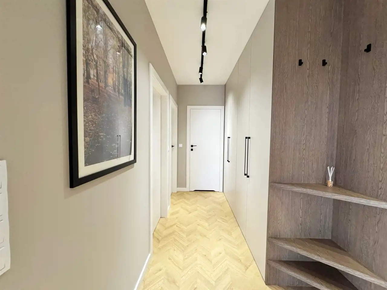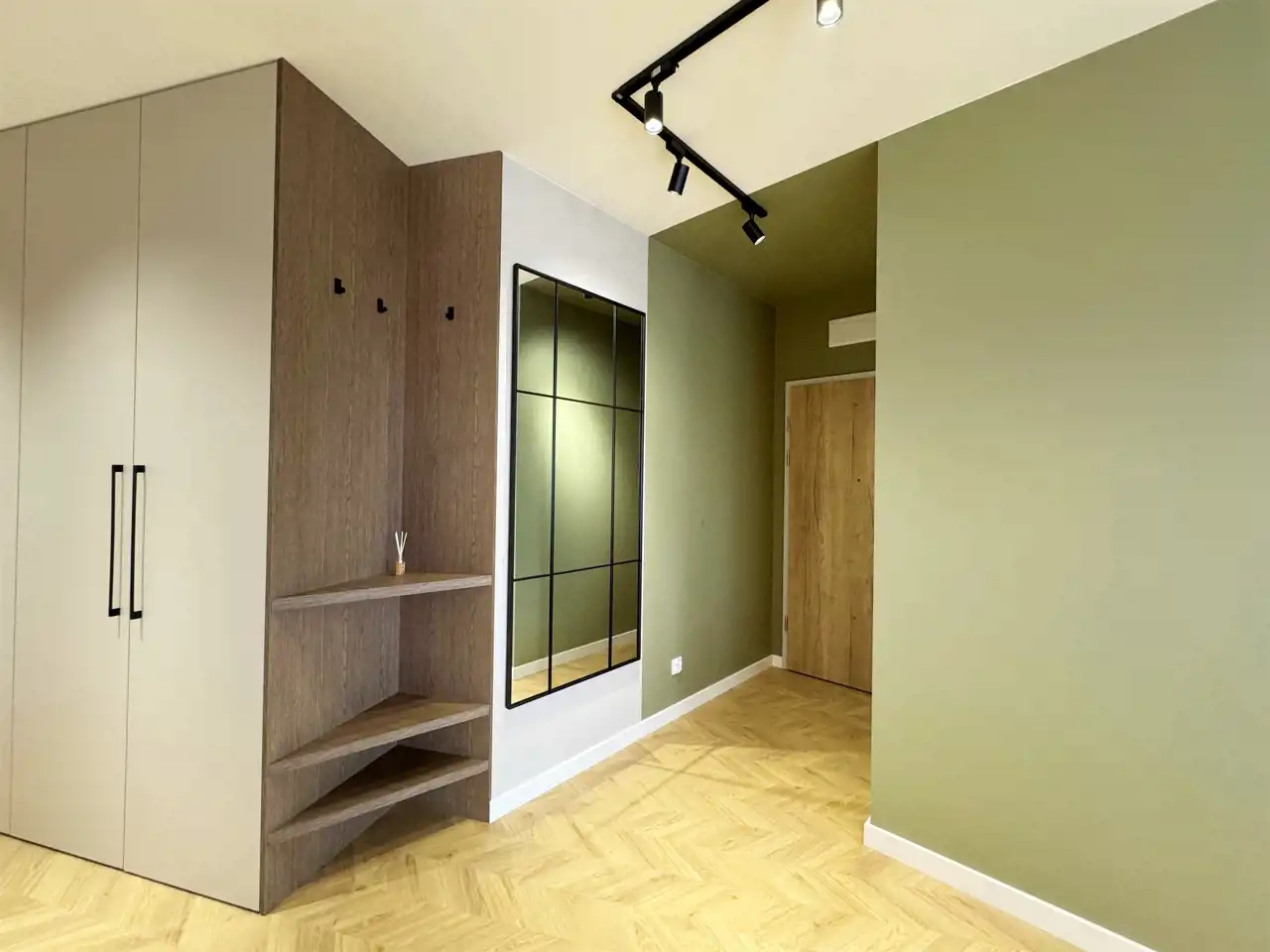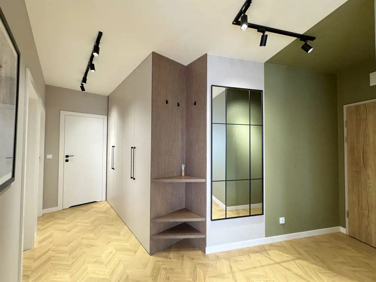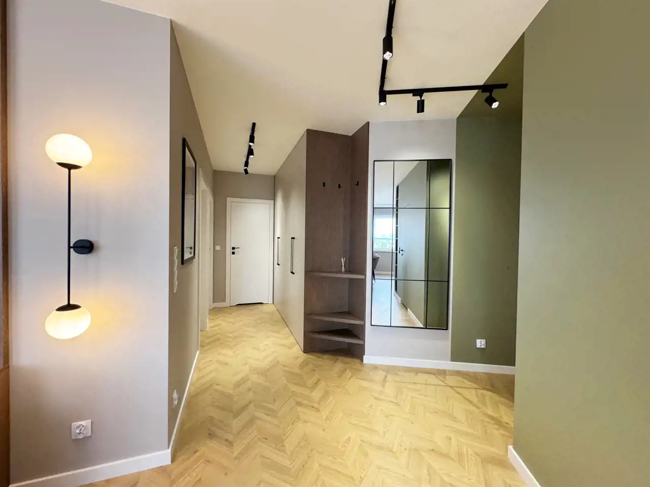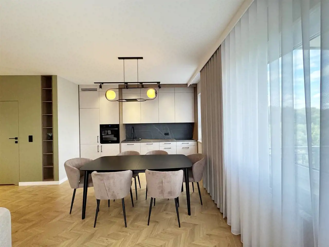 Całość uzupełniają designerskie lampy, które wieczorami tworzą nastrojową atmosferę, oraz starannie zaprojektowane zabudowy stolarskie – od pojemnych szaf w korytarzu po stylowe półki i szafki w salonie. Sercem mieszkania jest elegancka kuchnia z nowoczesną zabudową i sprzętem AGD, utrzymana w jasnych tonach z czarnymi detalami, która idealnie komponuje się z przyjemnymi, zielonymi akcentami na ścianach – wprowadzającymi świeżość i spokój.