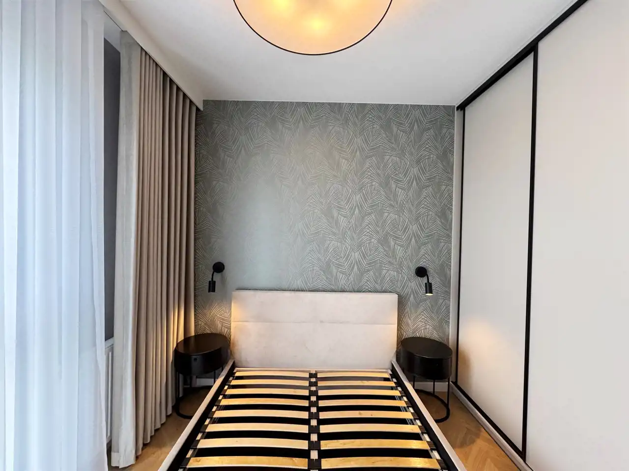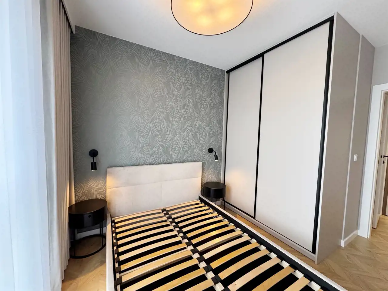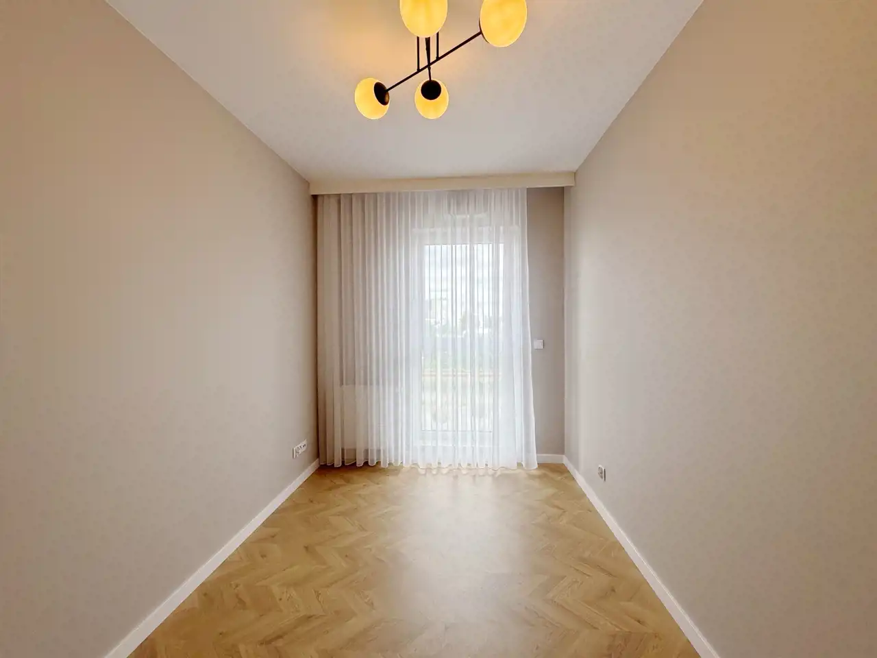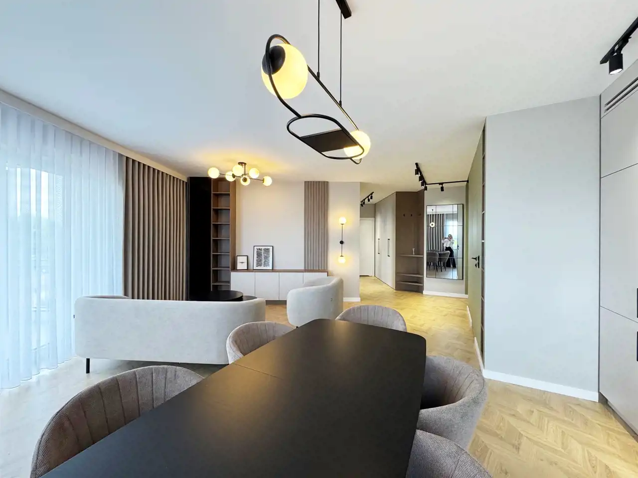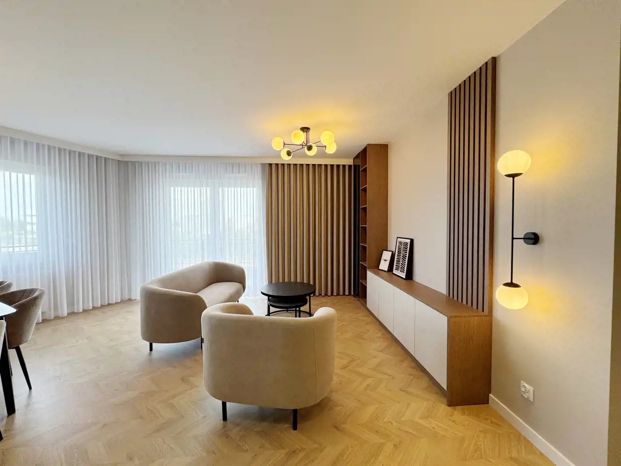 Mieszkanie zostało wykończone w wyjątkowym stylu, który łączy elegancję z nowoczesną przytulnością – ciepła podłoga w jodełkę nadaje wnętrzu klasy i harmonii, a duże panoramiczne okna z firanami i zasłonami szytymi na wymiar wpuszczają mnóstwo naturalnego światła.
