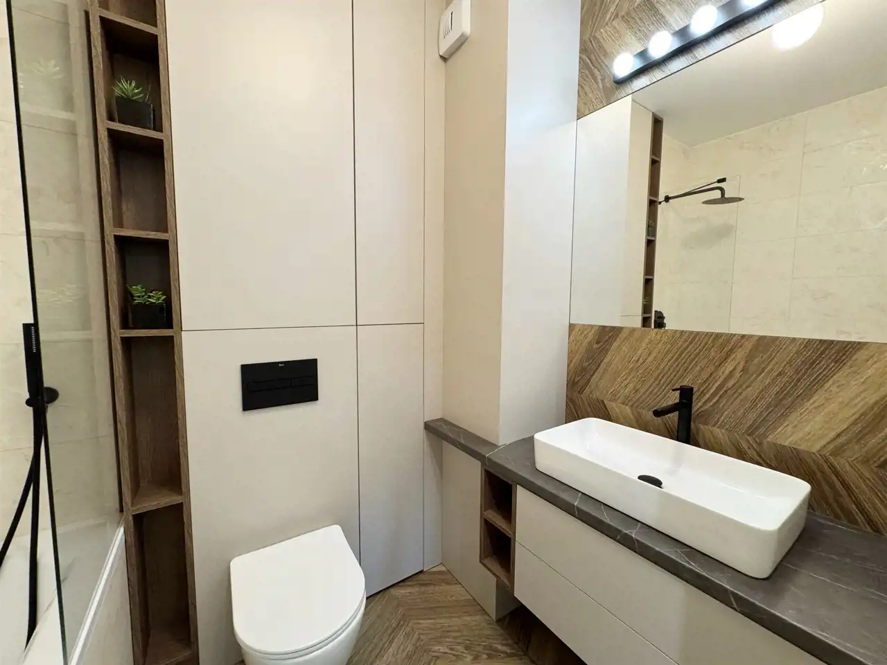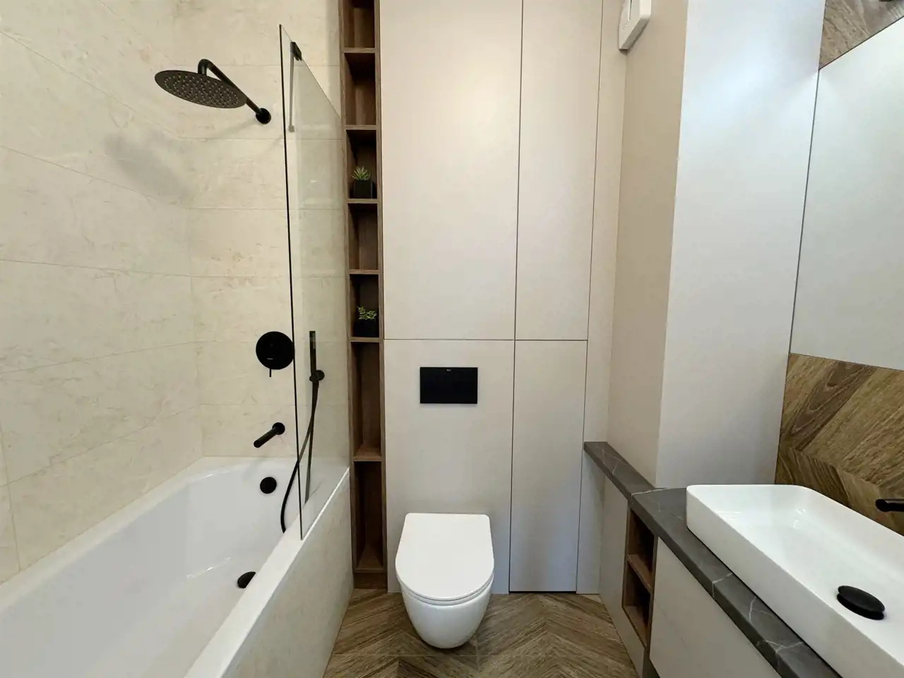 Obie łazienki wykończono w spójnym, nowoczesnym stylu – jedna z wanną, dużym lustrem i elegancką armaturą w czarnym macie, druga w formie toalety gościnnej z designerskimi lustrami, jasną zabudową i drewnianymi akcentami; całość uzupełniają meble na wymiar, które łączą estetykę z praktycznym przechowywaniem.