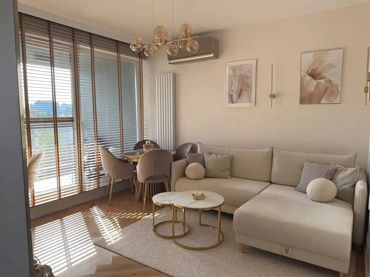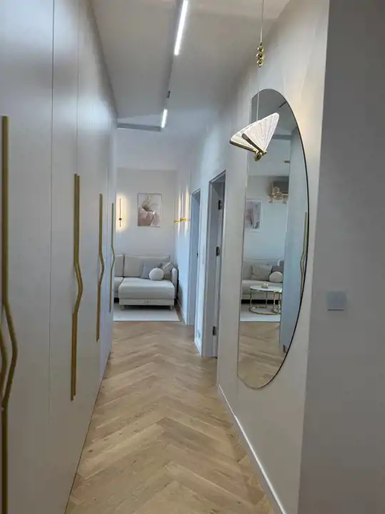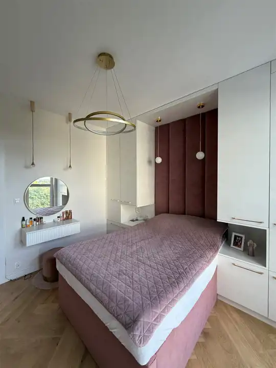 wykończenie w standardzie premium – drewniana podłoga Barlinek w jodełkę, designerskie lampy, pełne umeblowanie
