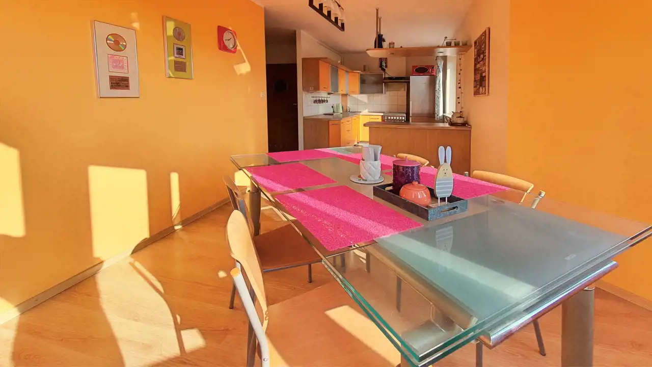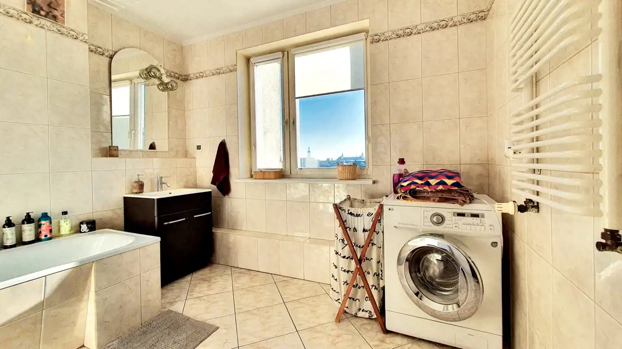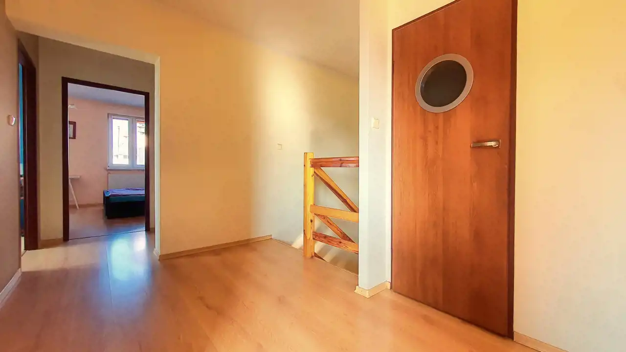 - Dwupoziomowe mieszkanie z sześcioma pokojami, garderobą, kuchnią z jadalnią oraz dwiema łazienkami.