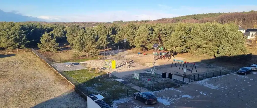 Lokalizacja zapewnia wygodę codziennego funkcjonowania dzięki bliskości placu zabaw, przychodni, sklepu, piekarni, kościoła oraz przystanku autobusowego. W niedalekiej odległości znajdują się również liczne punkty handlowo-usługowe, w tym Auchan, Leroy Merlin, IKEA, Decathlon, Agata Meble, Polo Market oraz apteka. Okolica jest cicha i spokojna, otoczona lasami oraz terenami zielonymi z rozbudowaną siecią ścieżek rowerowych, które umożliwiają dojazd do Myślęcinka w około 15 minut.