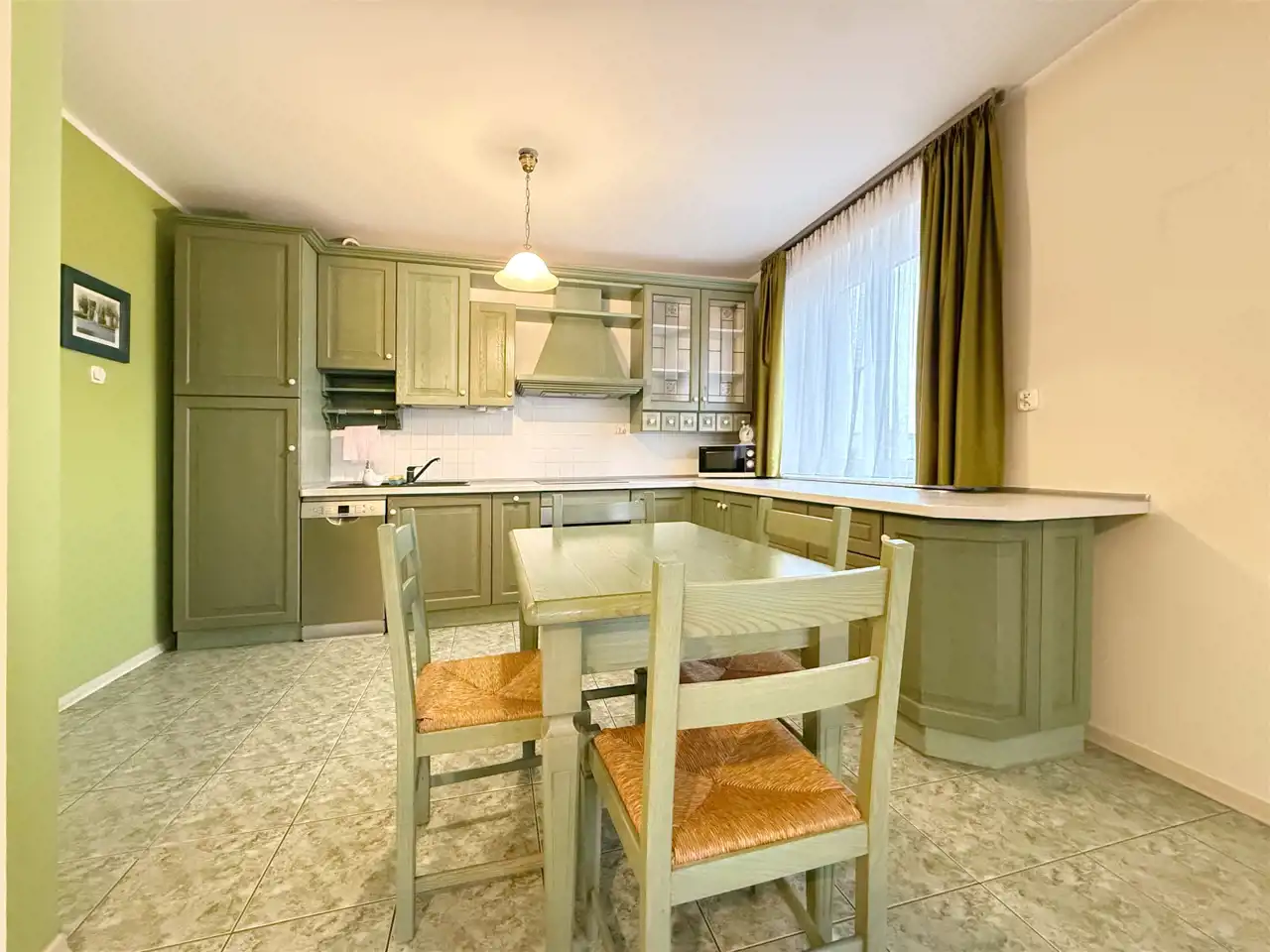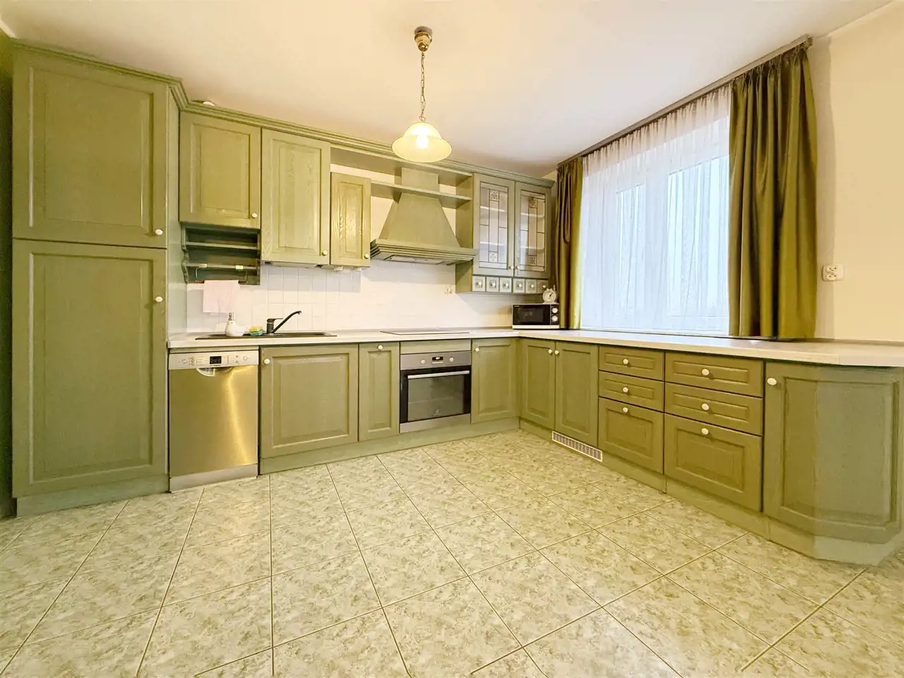 - Salon z aneksem kuchennym: około 39,5 m² (w pełni wyposażona kuchnia z nowym sprzętem AGD: lodówka, zmywarka, płyta indukcyjna, piekarnik, mikrofala; meble kuchenne są z linii włoskiej, nowe blaty, parapety marmurowe carrara)