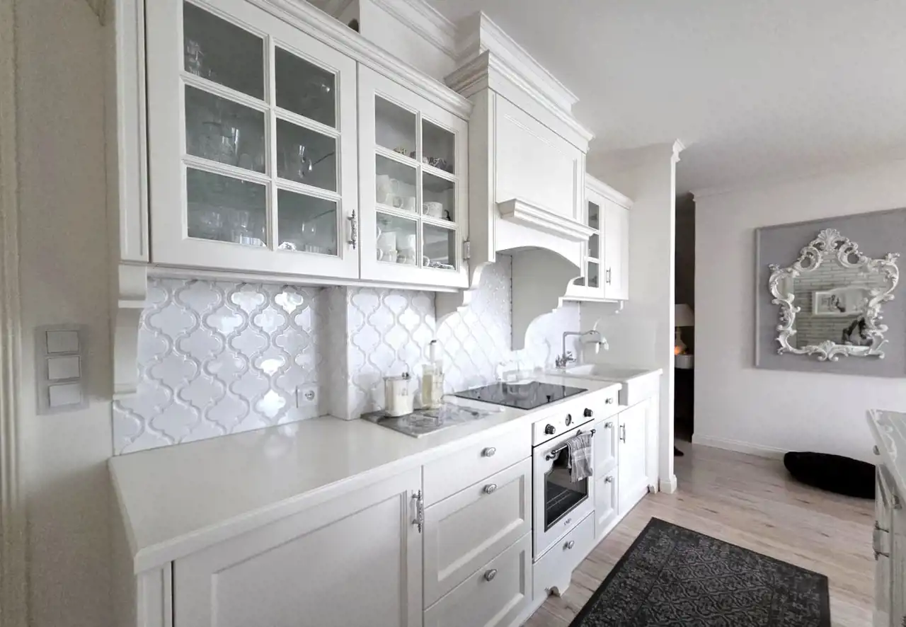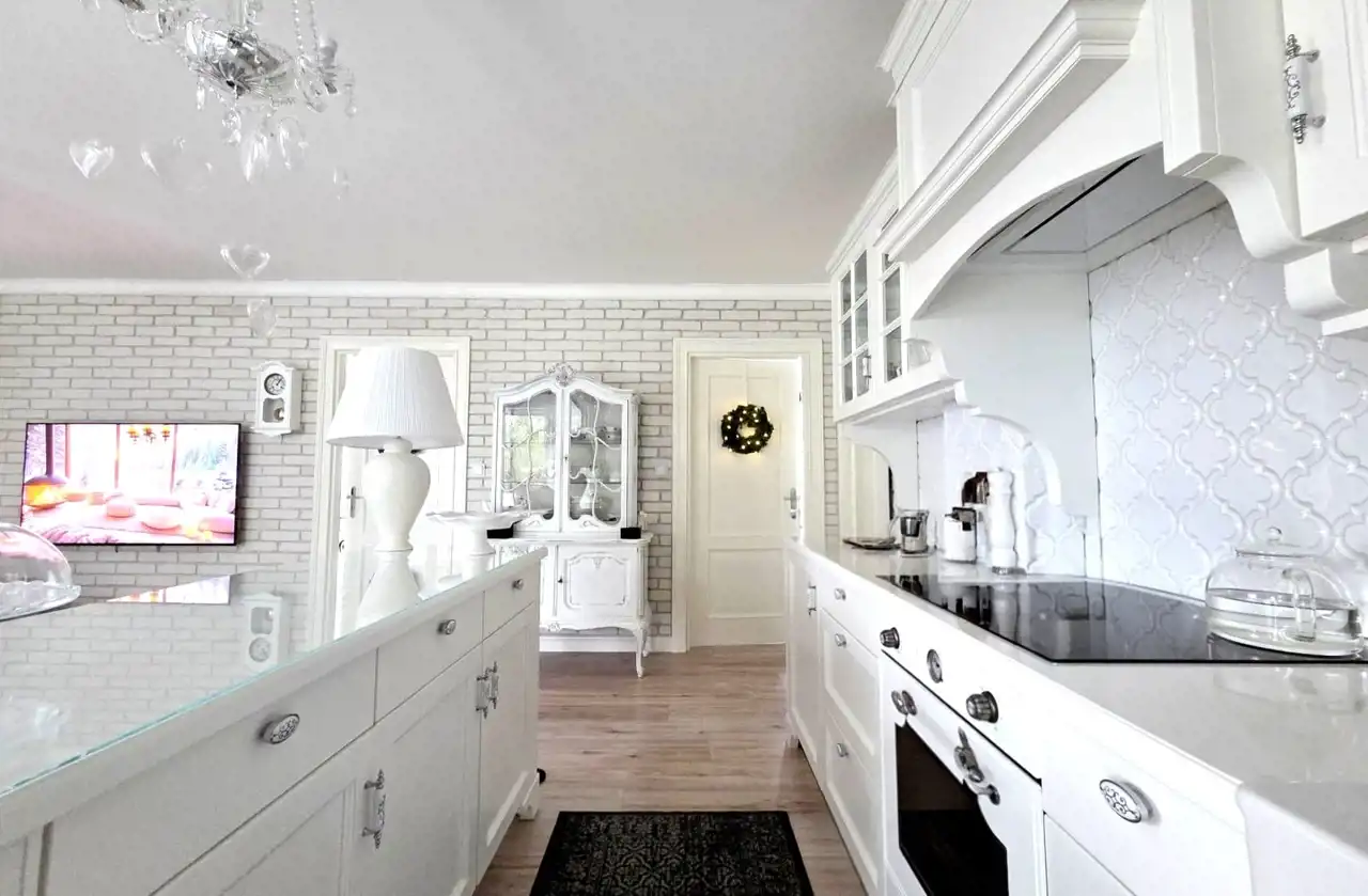 - Duży salon z strefą dzienną i kuchnią w zabudowie - dwustronny ze szklanymi dużymi drzwiami na roletach sterowanych.
