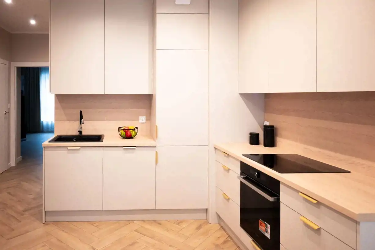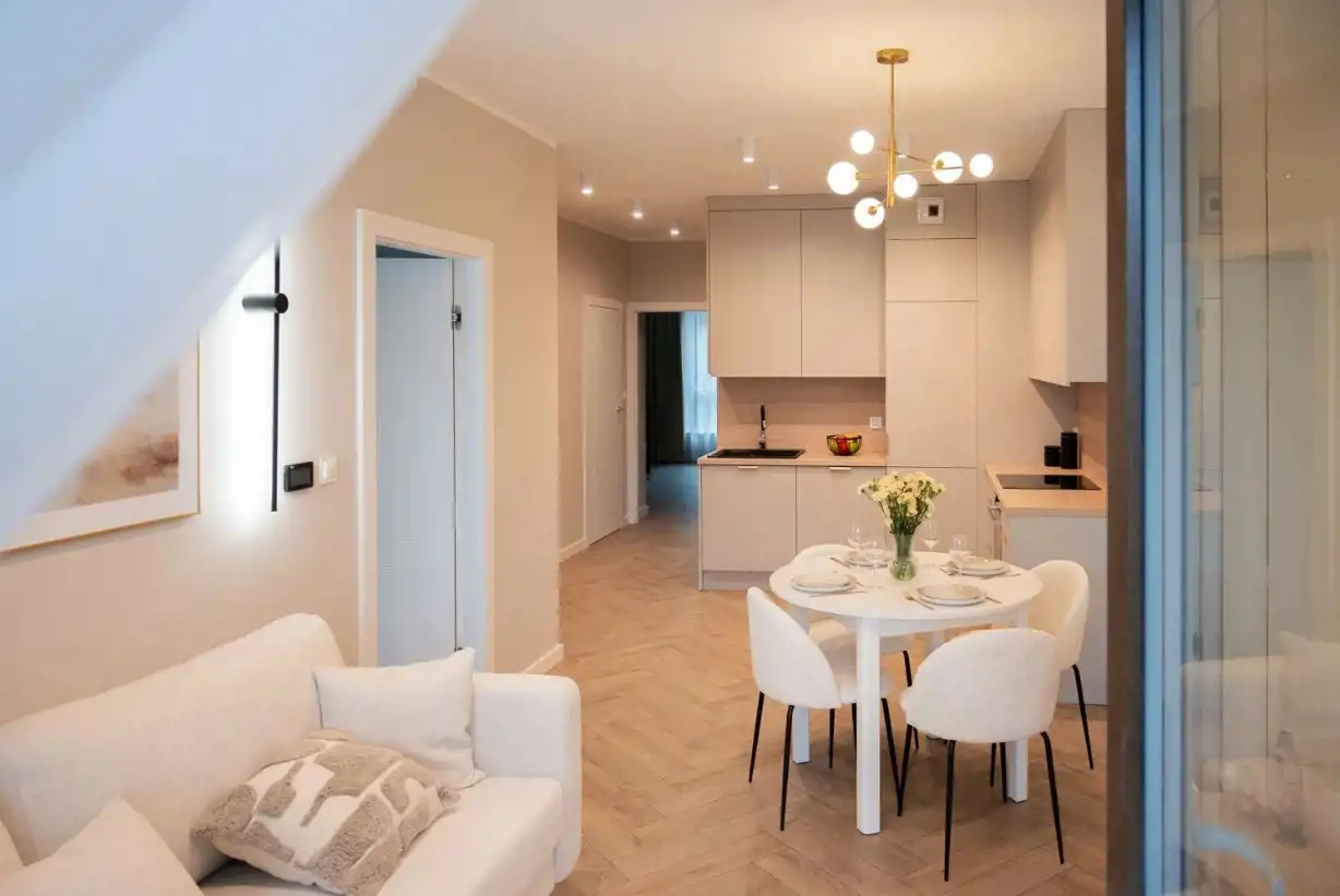 - Nowoczesnego salonu z aneksem kuchennym – serce mieszkania, w którym funkcjonalność spotyka się z designem. Otwarta przestrzeń dzienna zapewnia mnóstwo światła i swobody, a kuchnia wyposażona we wszystkie niezbędne sprzęty AGD umożliwia komfortowe przygotowywanie posiłków.