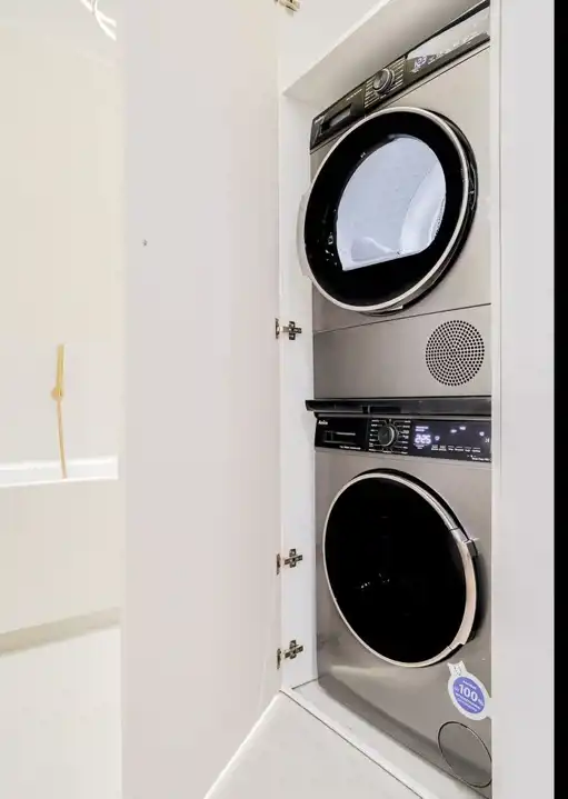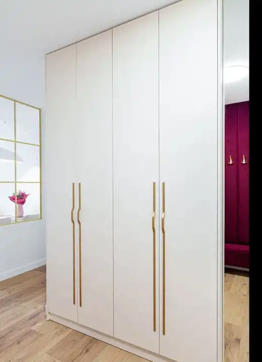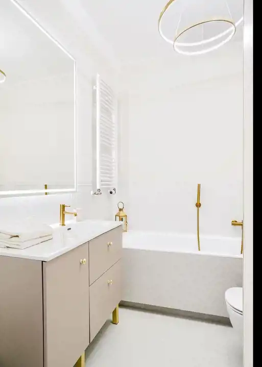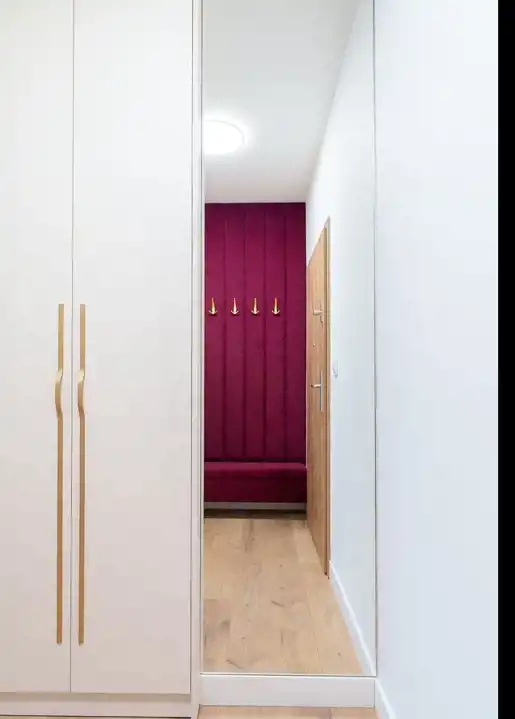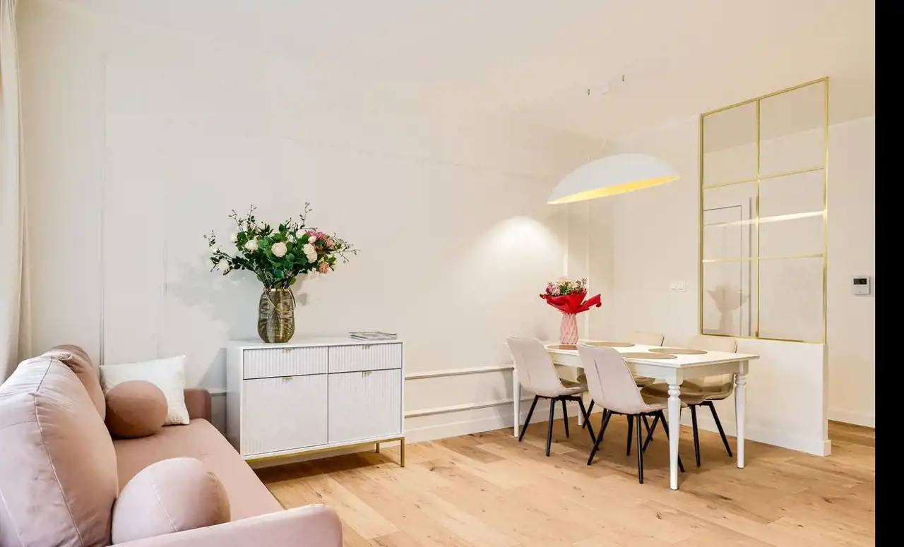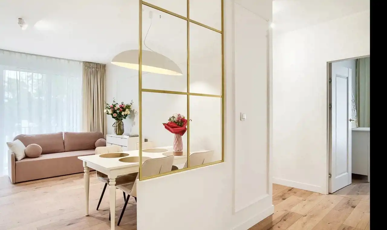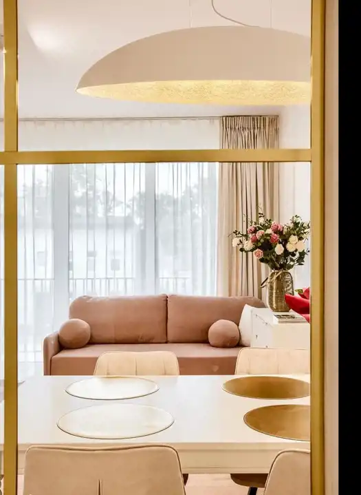 Mieszkanie wykończone w najwyższym standardzie zachwyca elegancją i dopracowaniem każdego detalu – nowoczesna zabudowa kuchenna z matowym wykończeniem, złota armatura i zintegrowane sprzęty AGD tworzą przestrzeń idealną do gotowania i spotkań, otwarty salon z dużym przeszkleniem wypełnia wnętrze naturalnym światłem, a pastelowa sofa, strefa jadalniana oraz stylowe detale – jak złote ramy lustrzanych paneli – nadają mu przytulności i klasy.