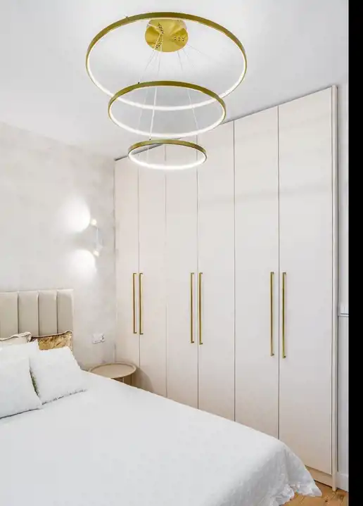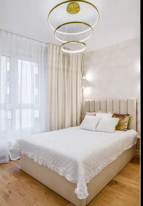 Sypialnia to oaza spokoju z designerskim oświetleniem, wygodnym łóżkiem i zabudowaną szafą,