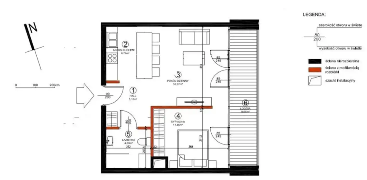 - Charakterystyka mieszkania 43.84 m2, 2 pokoje