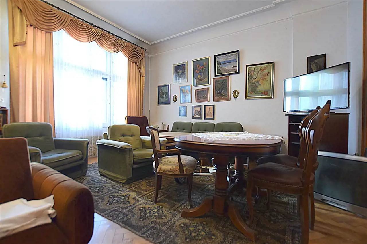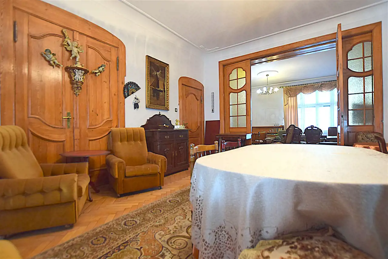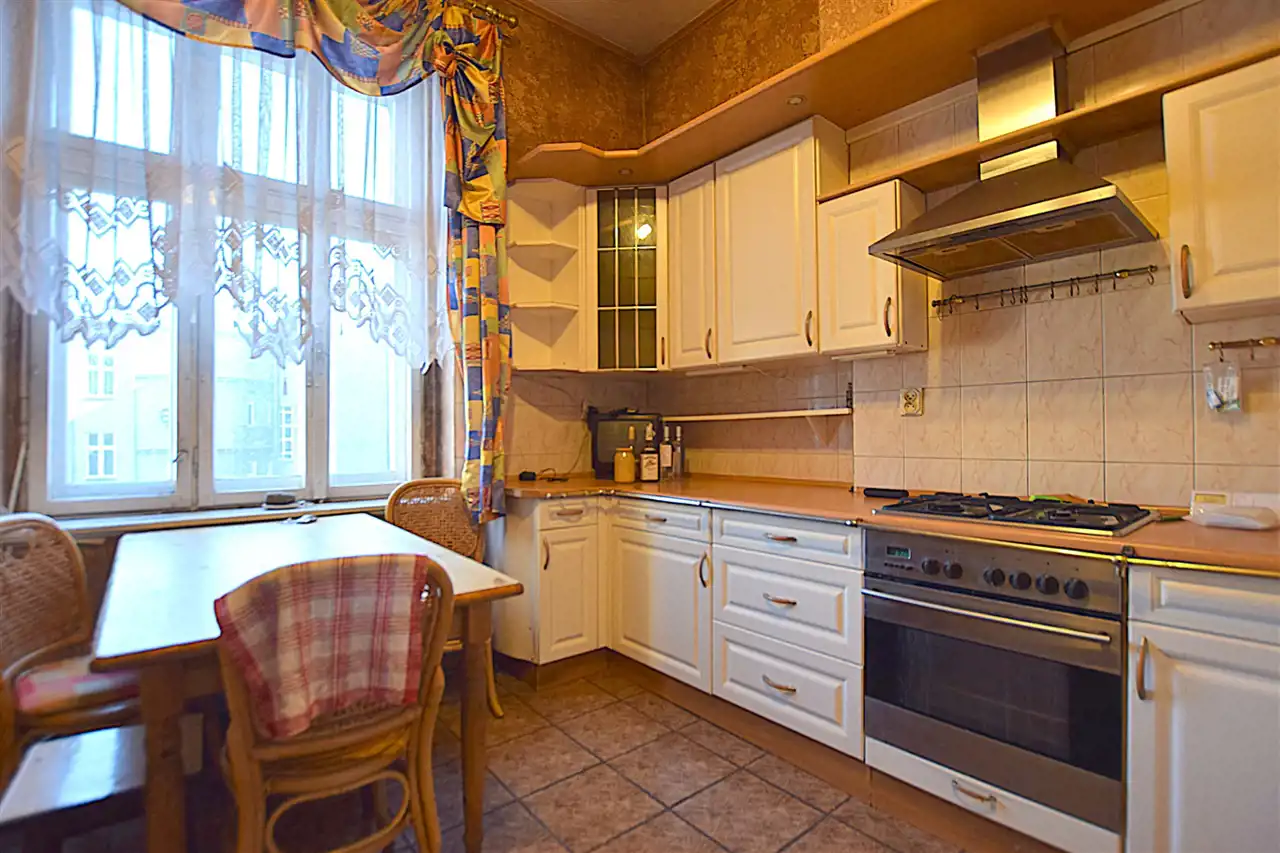 Piękne, drewniane podłogi, dostojne z litego drewna drzwi, ściany przyozdobione dziełami sztuki. Mieszkanie posiada całkiem spory balkon, co jest niejednokrotnie rzadkością w kamienicach. Wnętrza nadają klimatu, z powodzeniem sprawdzą się na pomieszczenia biurowe lub apartament w centrum miasta przy jednej z ciekawszej historycznie ulicy miasta. Mieszkanie składa się z czterech solidnej powierzchni pokoi (w tym dwa z wyjściem na balkon!). Kuchnia ze spiżarnią. Łazienki dodatkowo drugiego osobnego WC. Wita nas bardzo przestronny przedpokój w kształcie rotundy. Korytarz boczny doświetlony światłem