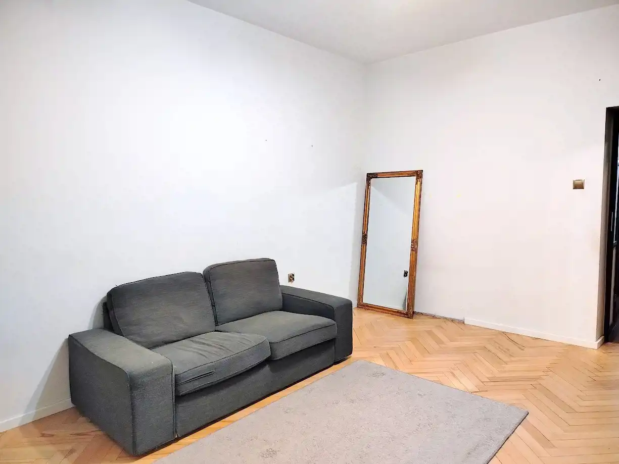 W pokoju rozkładana sofa, szafa i komoda. W przedpokoju zabudowana szafa.