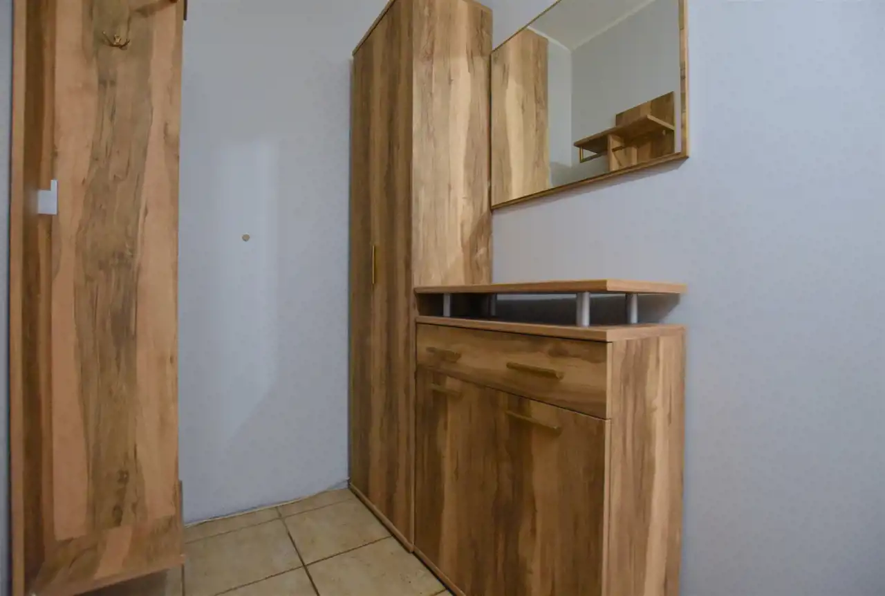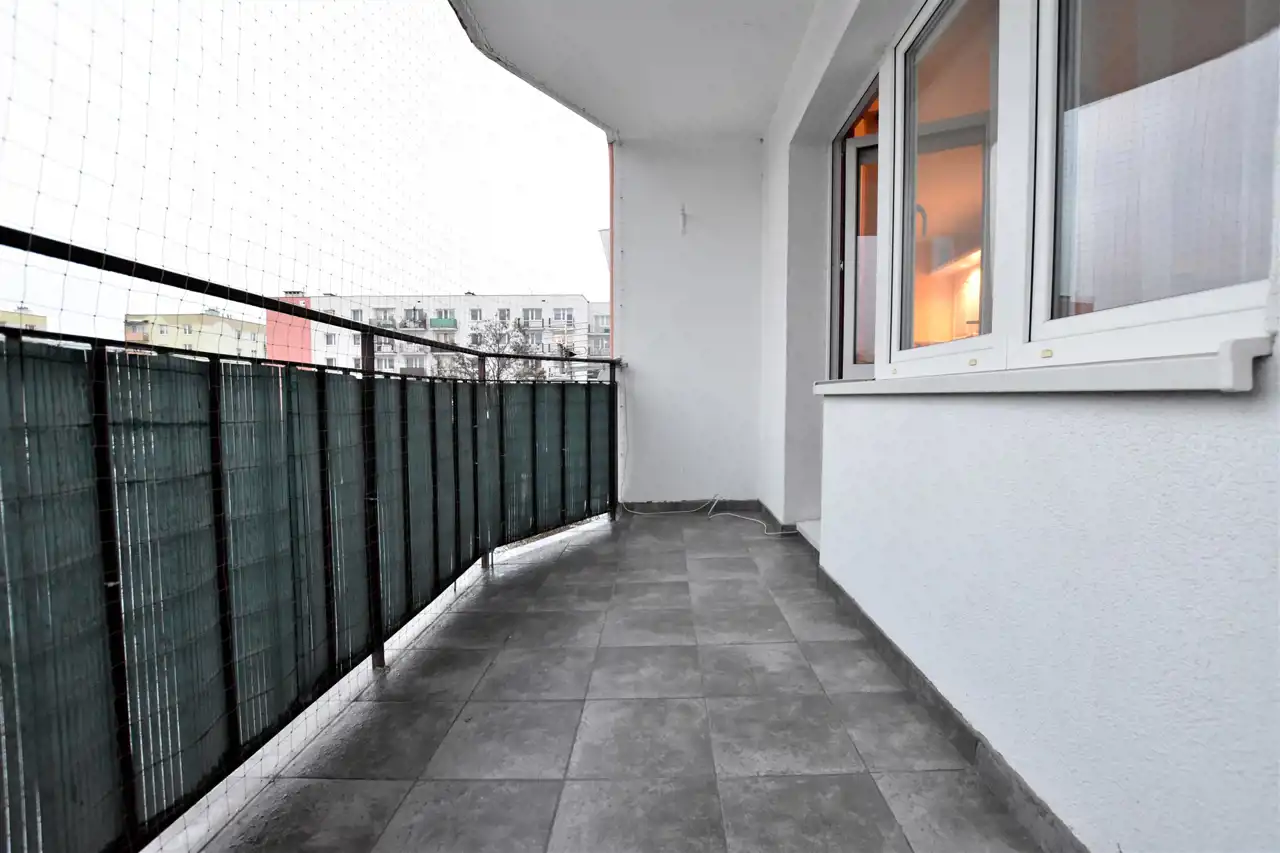 Mieszkanie w pełni umeblowane i wyposażone. W korytarzu pojemna szafa typu Komandor, szafka na buty i miejsce na odzież wierzchnią. Łazienka w całości wykafelkowana z wanną i pralką. W pokoju komody, rozkładana kanapa, wygodny fotel, stolik kawowy oraz rozkładany stół z krzesłami. W kuchni zabudowa szaf, lodówka, kuchenka gazowa, w szafach tzw. "wyposażenie drobne" (szklanki, talerze, garnki...itp). Z pokoju wyjście na balkon typu loggia (na całej długości pokoju). Zamontowana siatka ochronna przed gołębiami.
