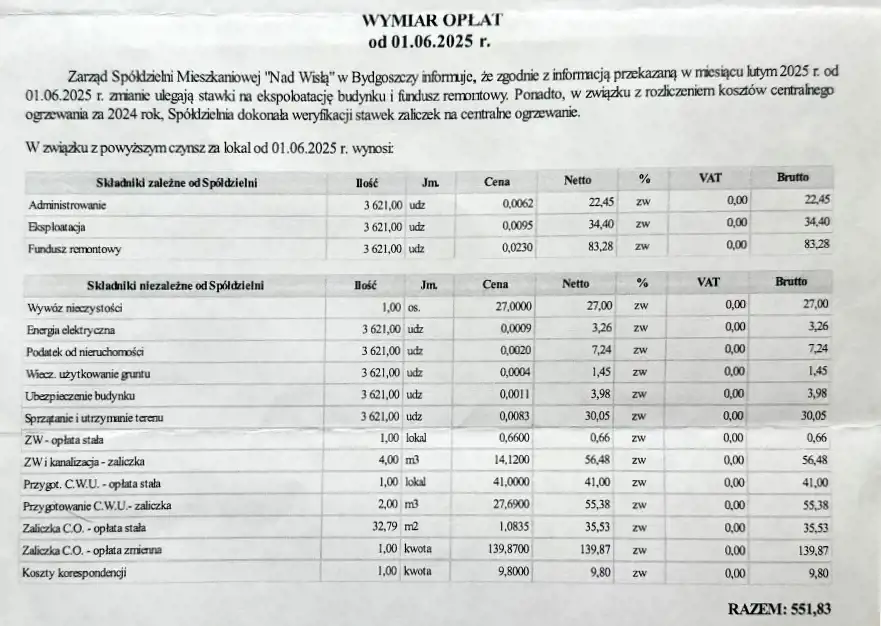 - 550zł/ os czynsz do spółdzielni mieszkaniowej (w tym m.in. zaliczki na wodę, śmieci i ogrzewanie),