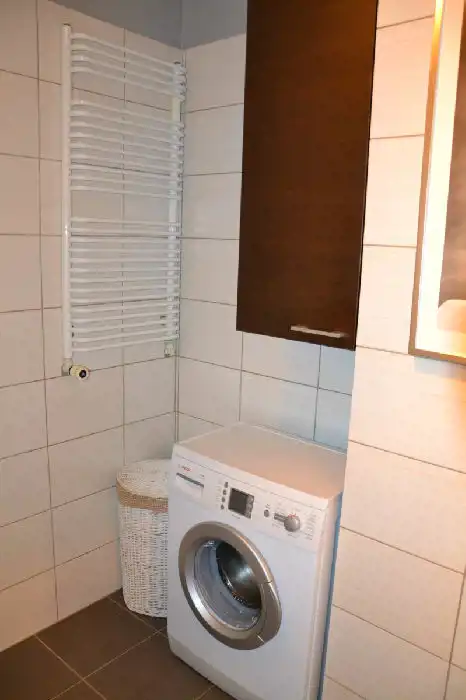 Kuchnia z zabudową wyposażona w kuchenkę i lodówkę. W przedpokoju pojemna szafa typu Komandor. Łazienka z natryskiem, na wyposażeniu pralka.