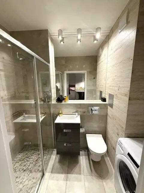 Łazienka z wc - pralka, kabina prysznicowa, szafka pod zlewem, nowoczesna glazur i terakota.