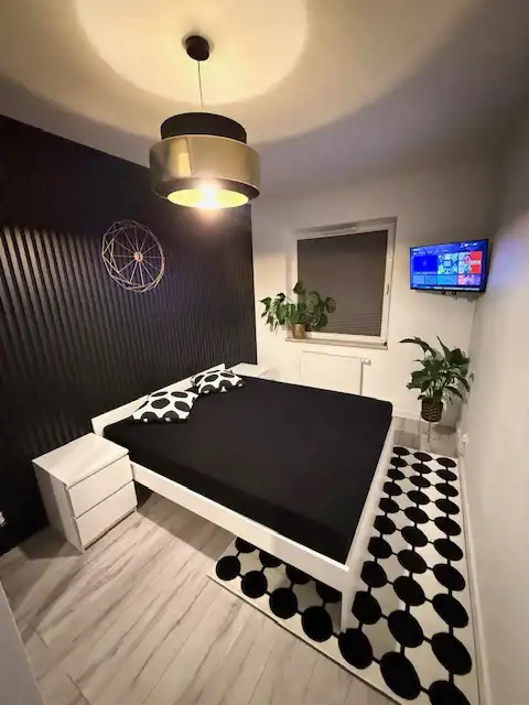 Sypialnia - łóżko z porządnym materacem, telewizor, szafa pakowna w zabudowie, panele, gładź gipsowa.