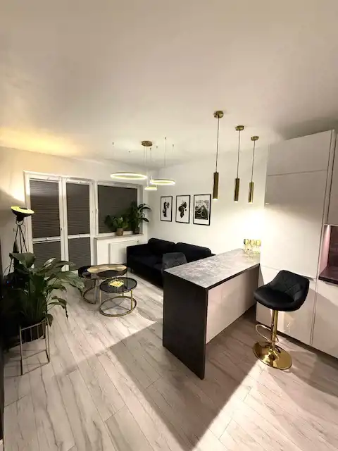 Salon z aneksem kuchennym - NOWE zmywarka, lodówka, pochłaniacz pary, glazura i terakota, zabudowa mebli wysoki połysk białe). Wyspa z wysokimi stołkami nad nim oświetlenie klimatyczne.