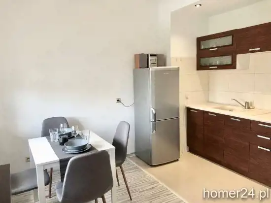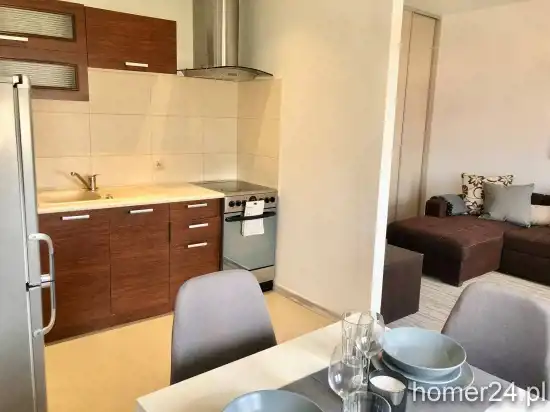 Kuchnia jako aneks- zabudowa ze sprzętem: lodówka, kuchenka z płytą ceramiczną, okap, zlewozmywak z baterią, sztućce, zastawa stołowa, szklanki, kieliszki do wina, szklanki, serwis kawowy.