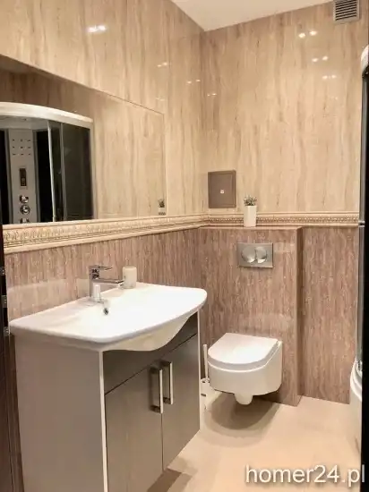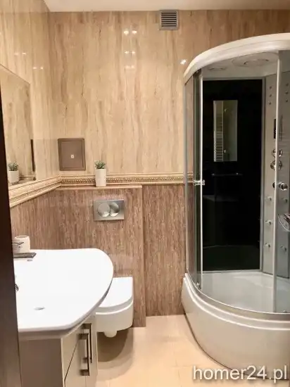 łazienka około 4mkw. w kaflach, kabina z hydromasażem i radiem, pralka.