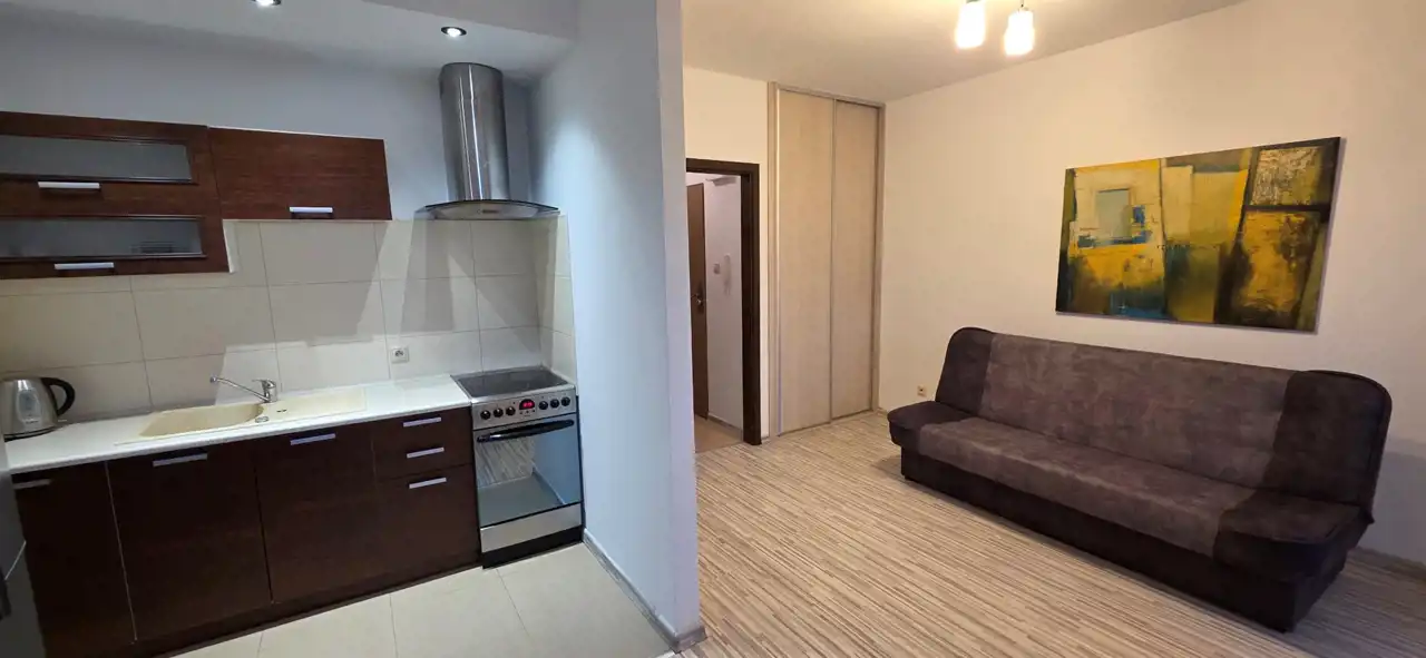 Przytulny, słoneczny pokój około 21mkw. z funkcjonalnym aneksem kuchennym.