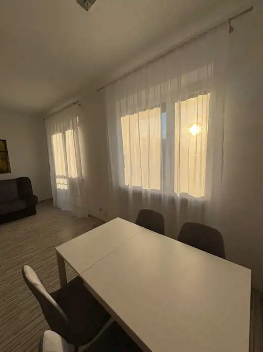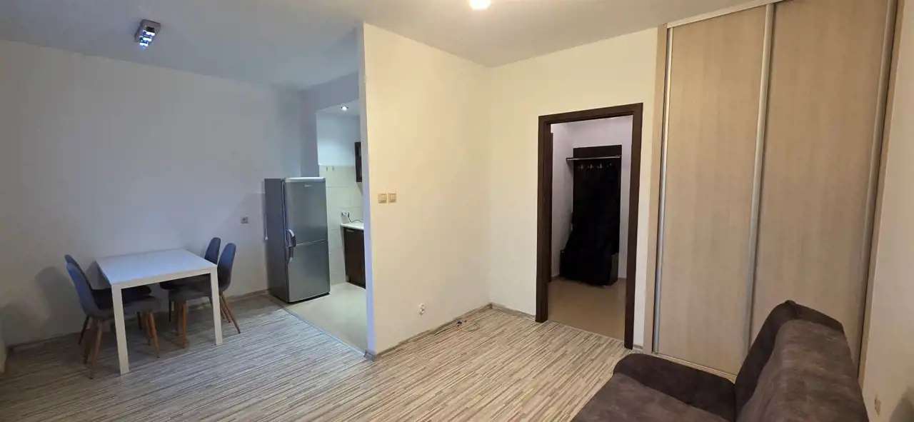 Umeblowanie: sofa, szafa w zabudowie, stół z 4 krzesłami.