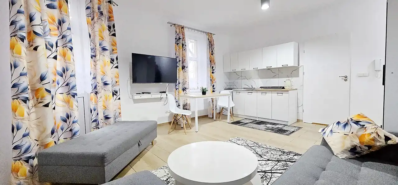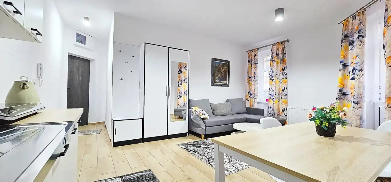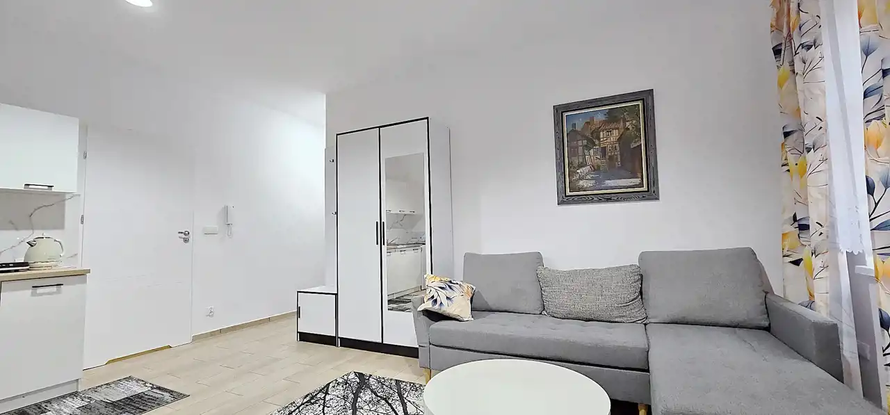 To przestrzenne i słoneczne mieszkanie o powierzchni użytkowej 25,55 m2 składa się z salonu z aneksem kuchennym, przedpokoju i łazienki.