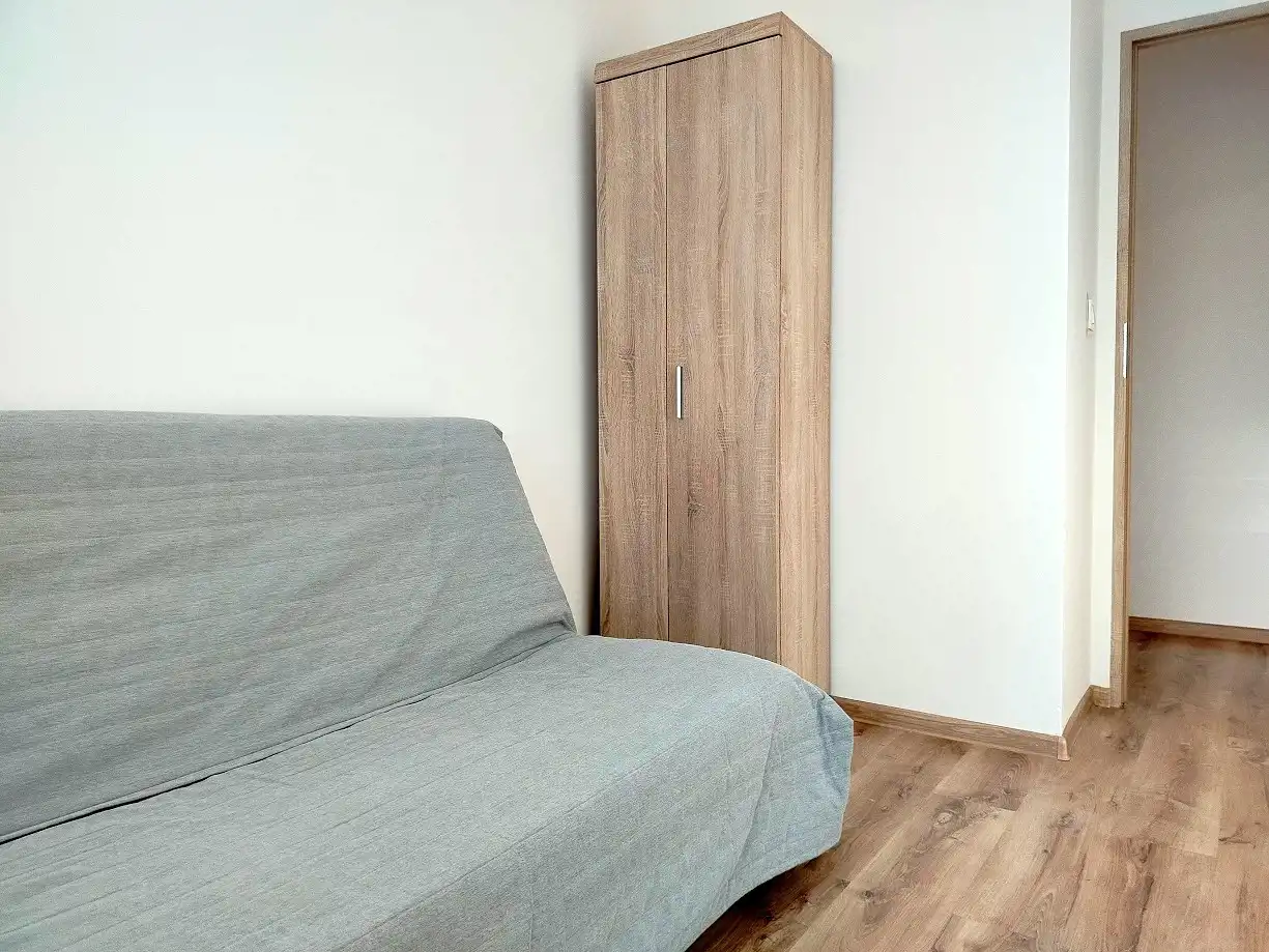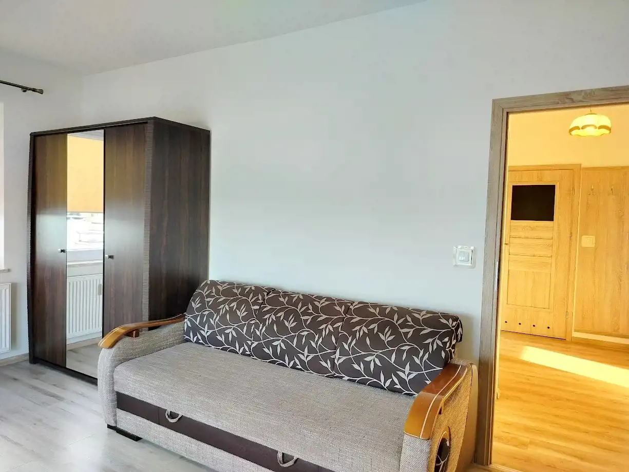 W mniejszym pokoju szafa oraz rozkładana kanapa.