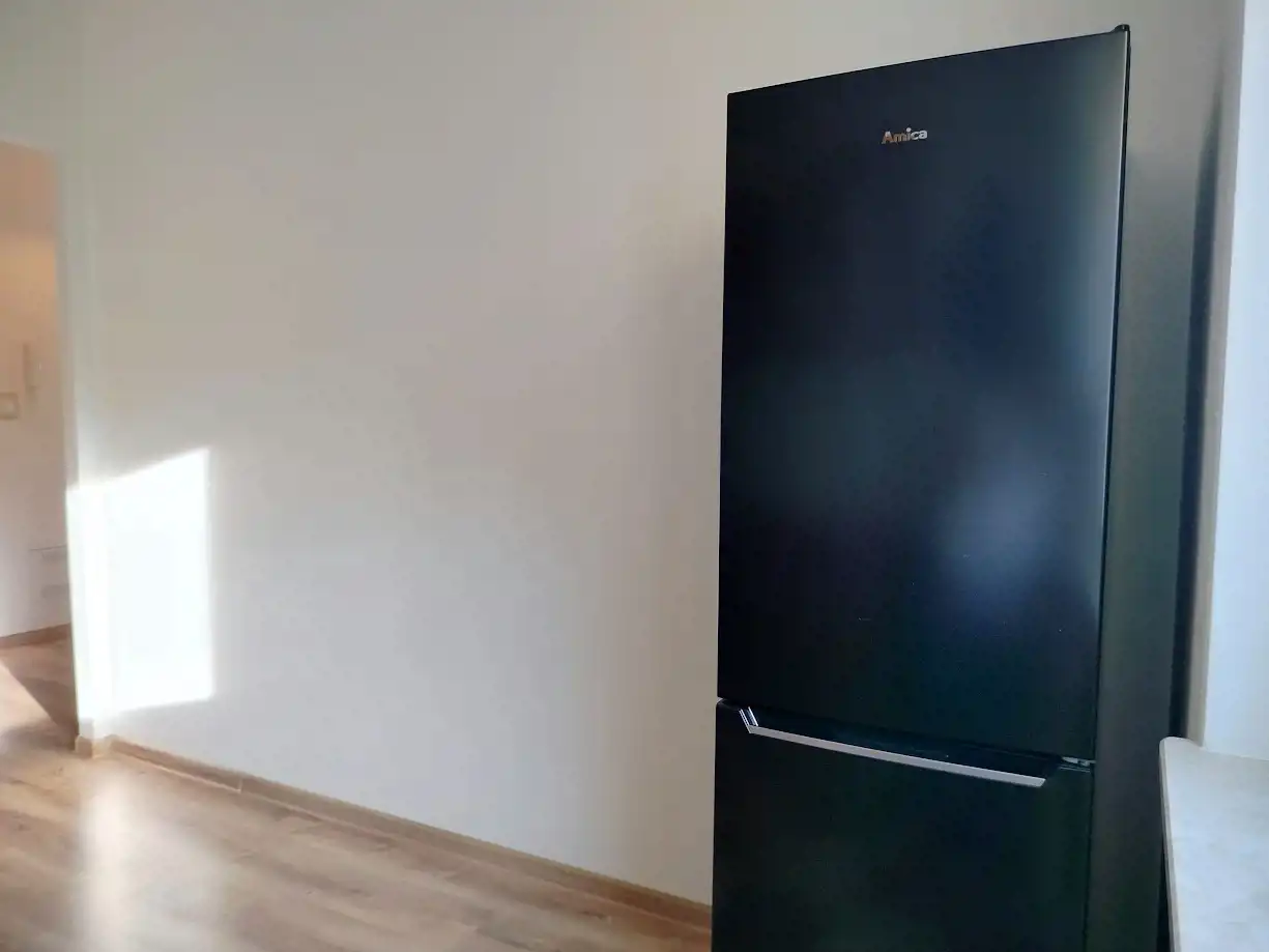 Kuchnia z zabudową wraz płytą grzewczą, piekarnikiem oraz dużą lodówko-zamrażarką.
