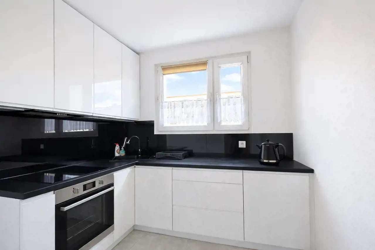 Kuchnia wyposażona zabudowę wraz ze sprzętem AGD bez lodówki.