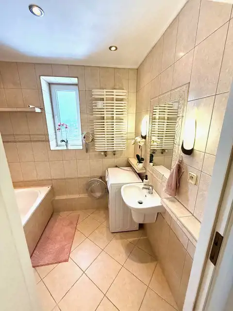 ŁAZIENKA o pow. 4m2. - wanna, glazura i terakota z oknem z pralką, szafką.