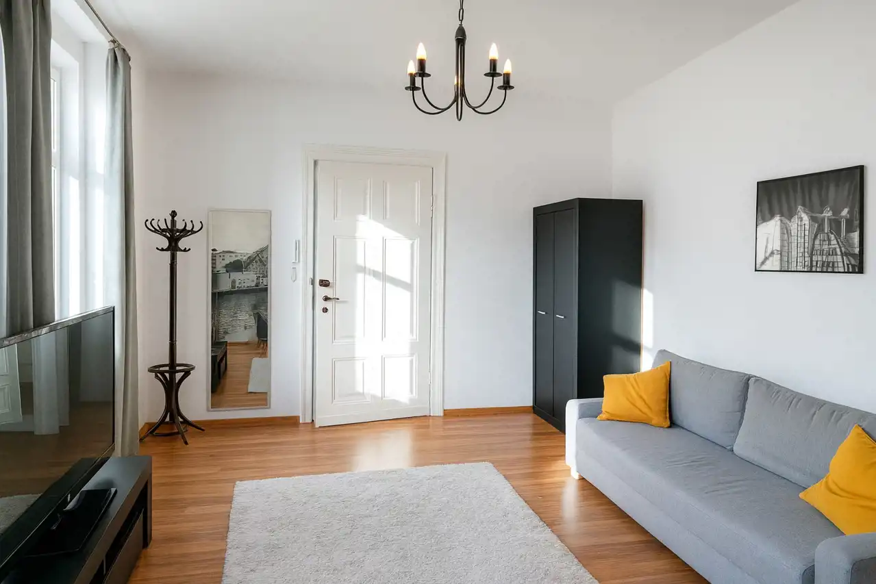 Mieszkanie 40 m² – jasne, przestronne, wysokimi sufitami i dużymi oknami. W pełni umeblowane. Gotowe do wprowadzenia.
