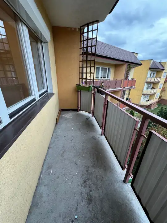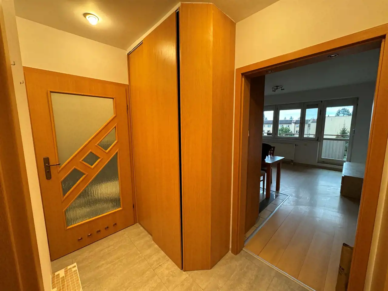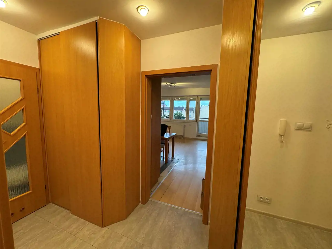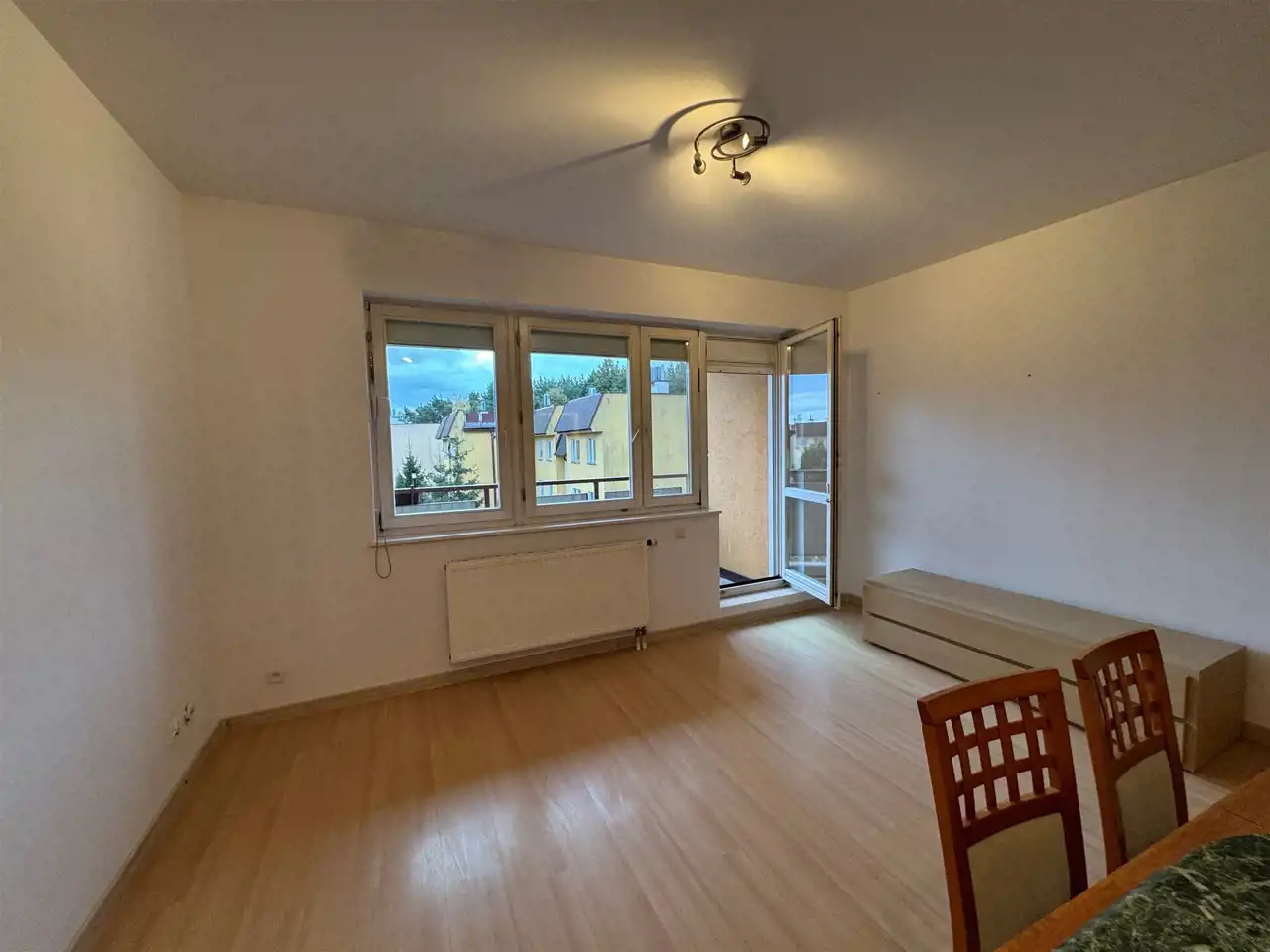 Funkcjonalny rozkład mieszkania - salon z aneksem ( nie ma stołu z krzesłami) , pokój z szafą w zabudowie ( nie ma stelażu łóżka), pokój -pusty, łazienka z wc. , przedpokój w zabudowie .