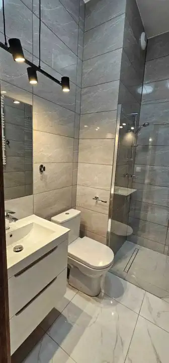 prysznic, WC, umywalka z szafkami, pralka