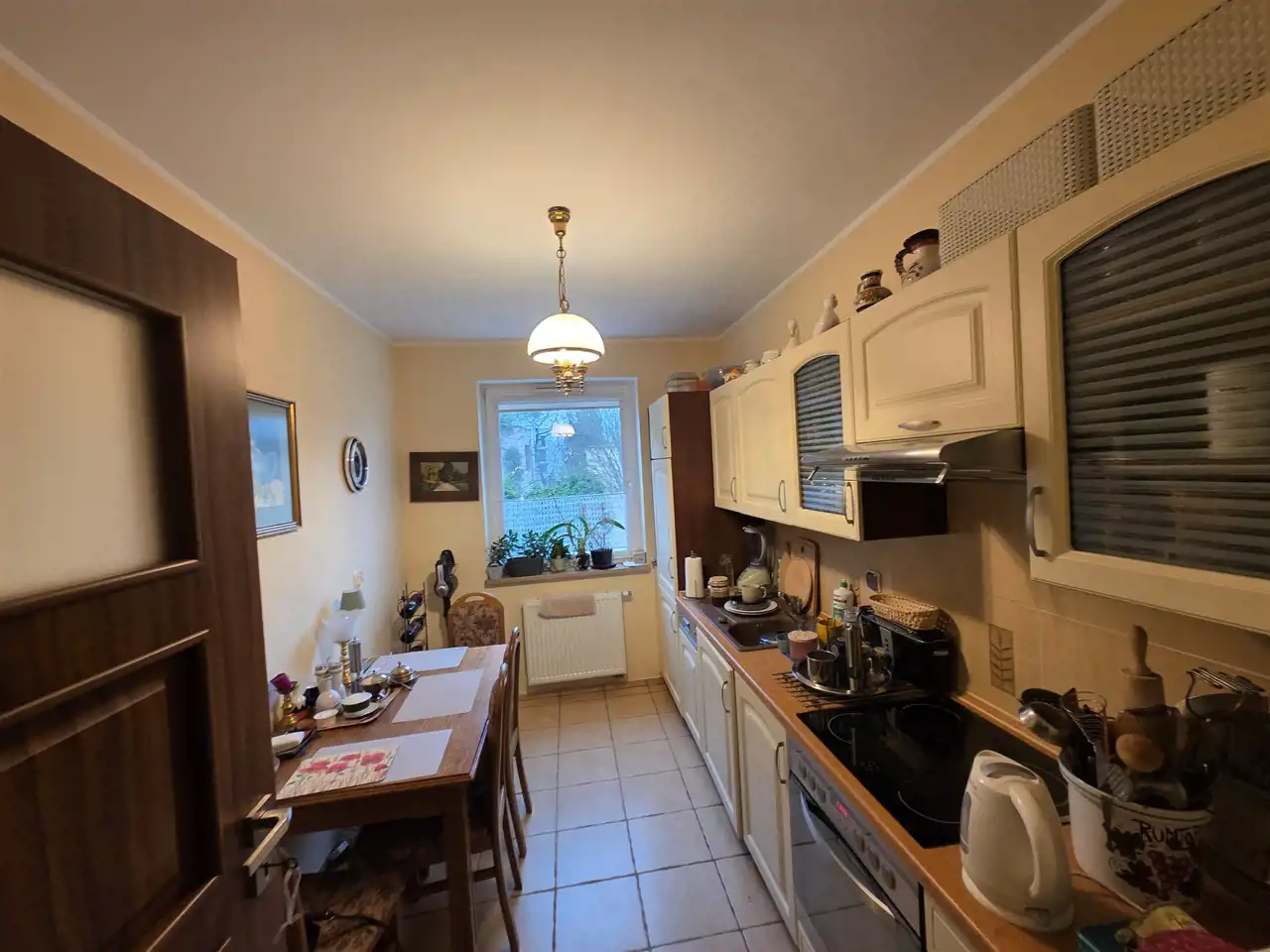 Kuchnia ładnie urządzona, wyposażona w płytę ceramiczną, zmywarkę, piekarnik, lodówkę, okap.