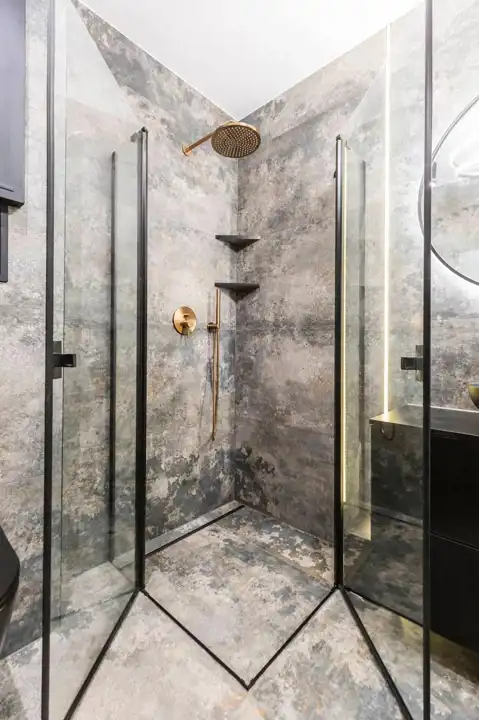 Łazienka z z prysznicem i pralką.