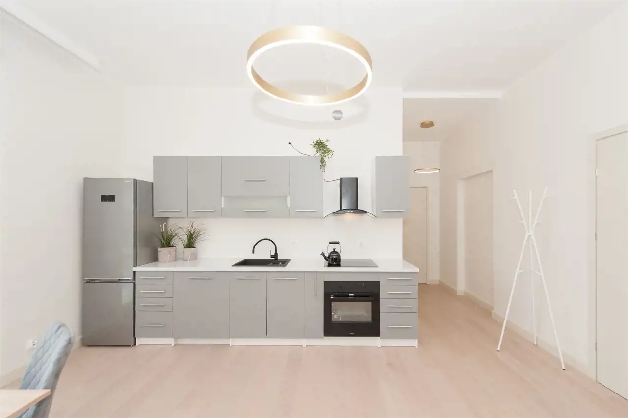 Kuchnia z lodówka, zmywarką, kuchenką indukcyjną z piekarnikiem.