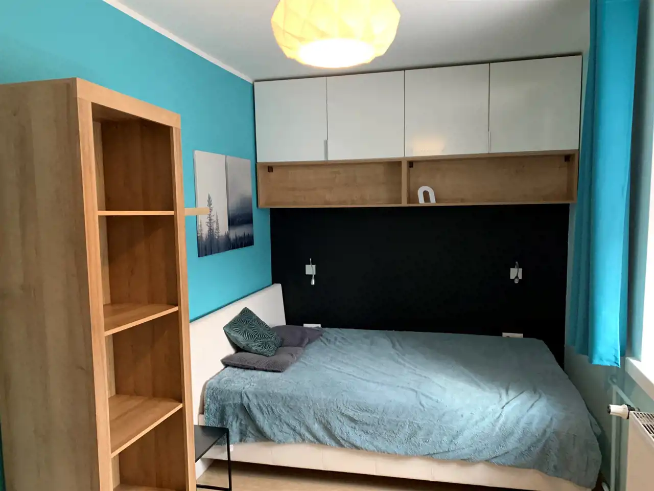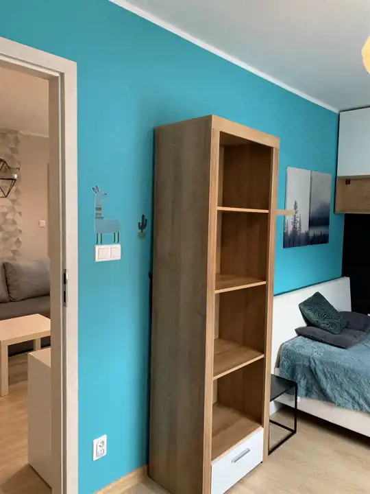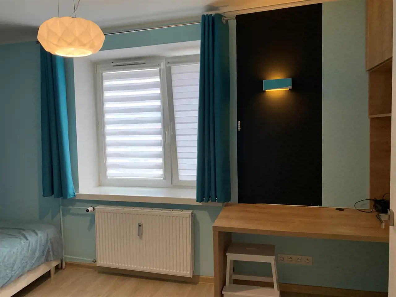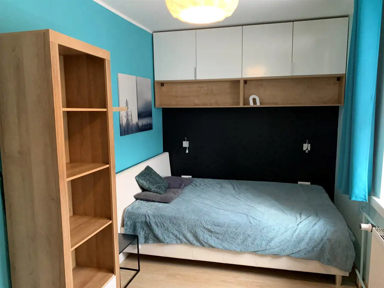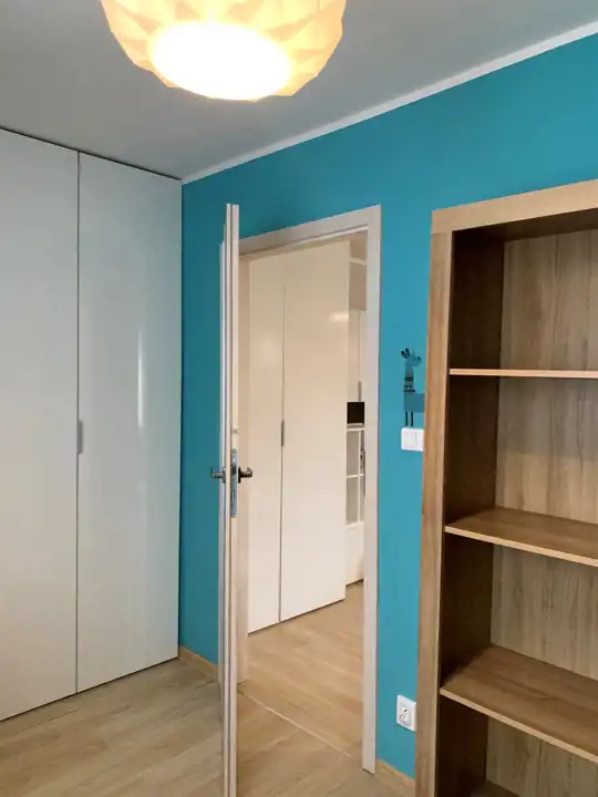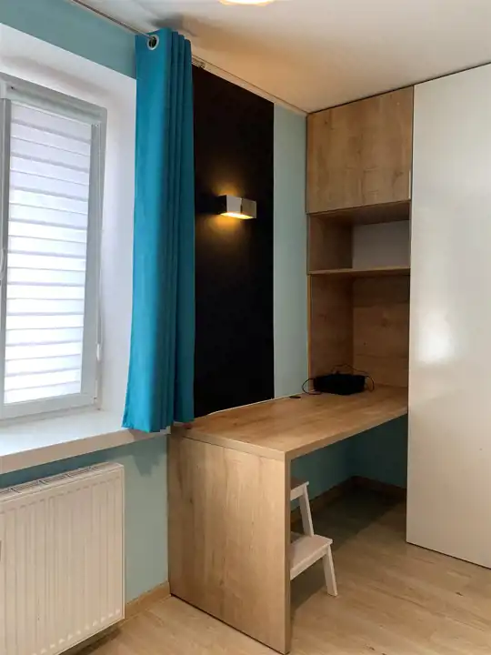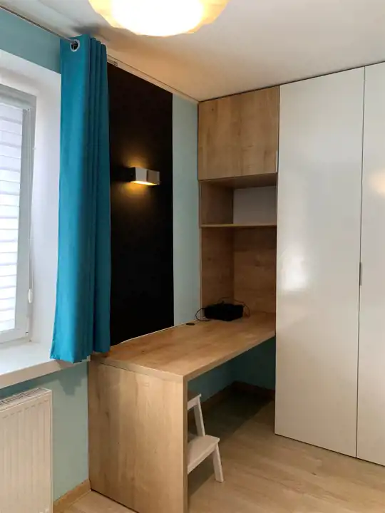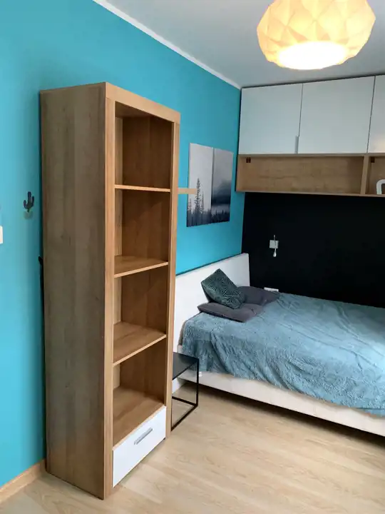 Sypialnia o pow. 12m2. Łóżko dwuosobowe z materacem i narzuta, biurko w zabudowie I duża szafa, komoda. Rolety, zasłony, zabudowa półkami nad spaniem.