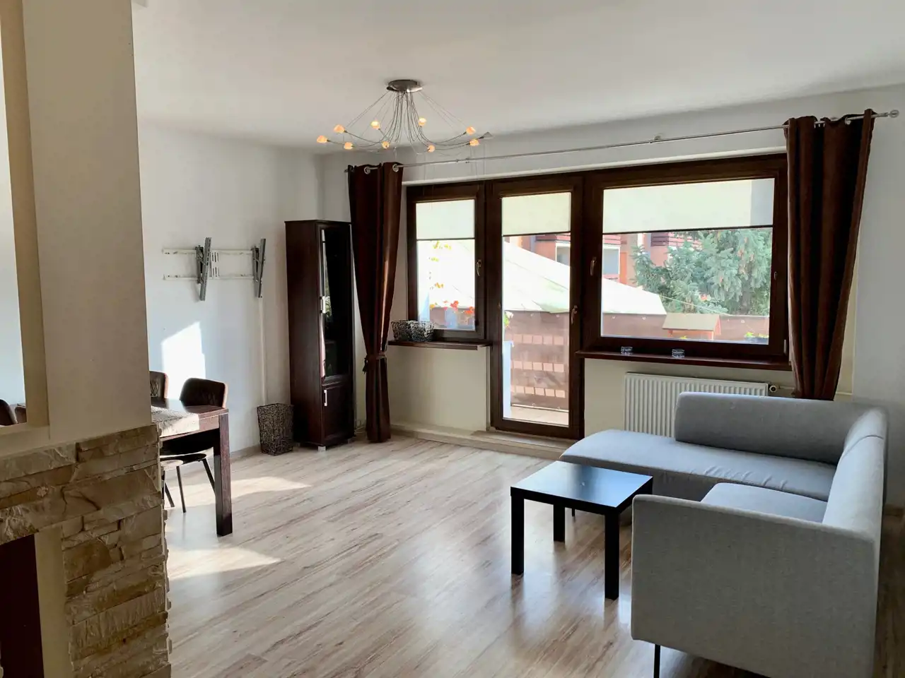 Przestronny, jasny salon z aneksem kuchennym i dużym balkonem.