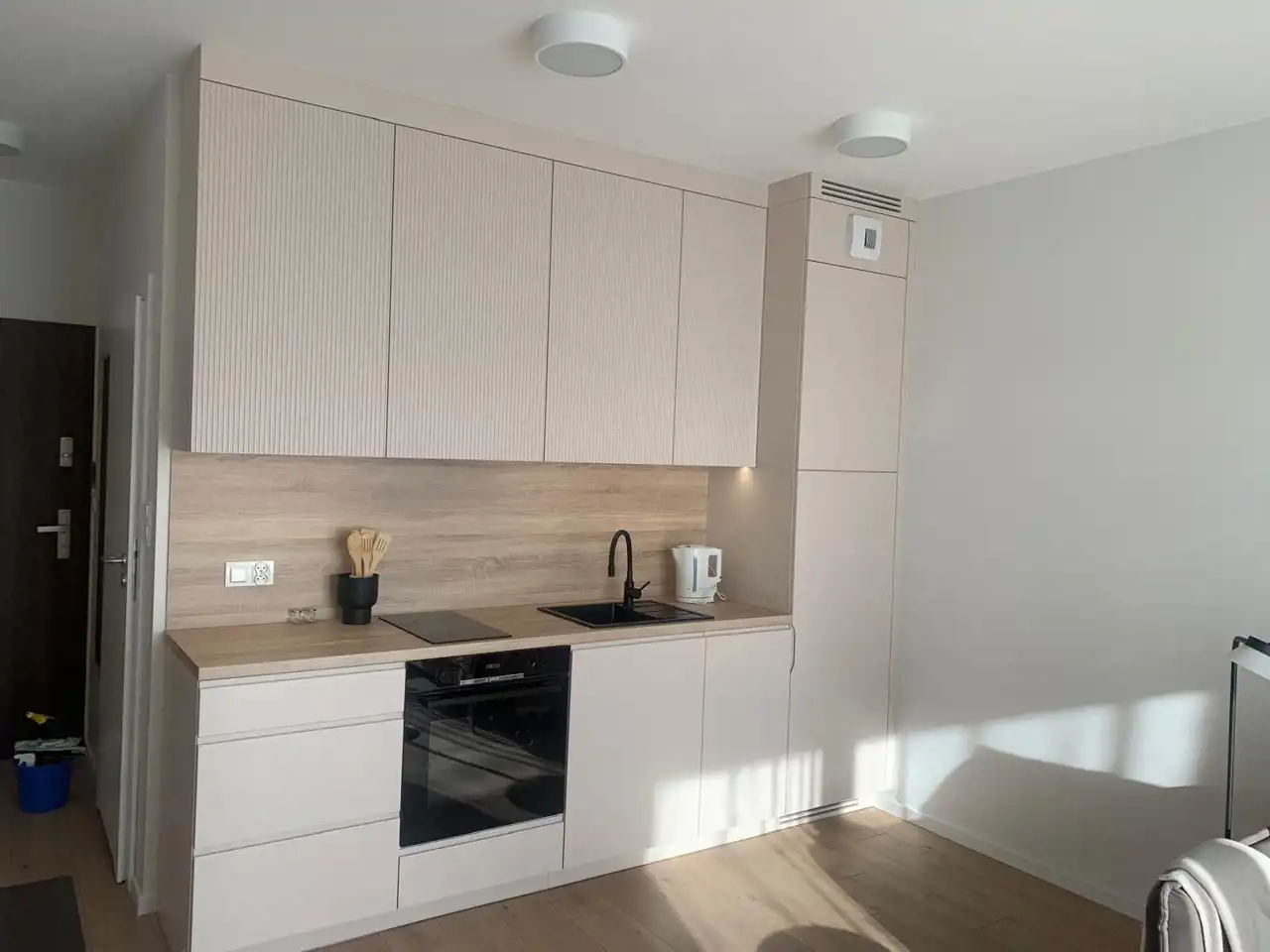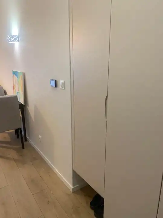 - zabudowa korytarza, łazienki i kuchni wykończona lakierem strukturalnym, w aneksie kuchennym górne szafki ryflowane. Okucia i prowadnice - Blum.
