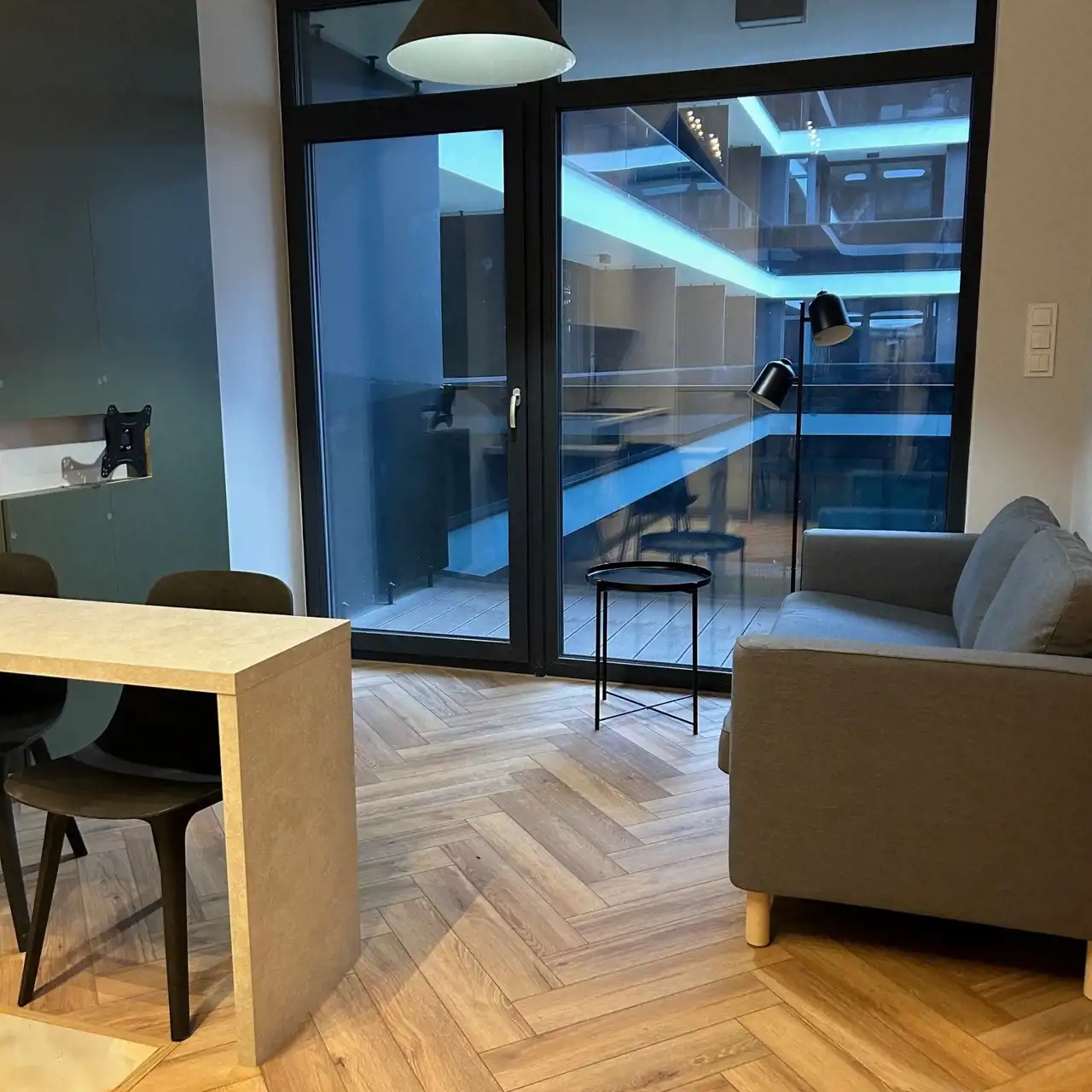 Z salonu i z sypialni mają Państwo wyjście przez nowoczesne, rozsuwane szyby balkonowe na piękny duży taras, z miejscem na meble wypoczynkowe i rośliny.