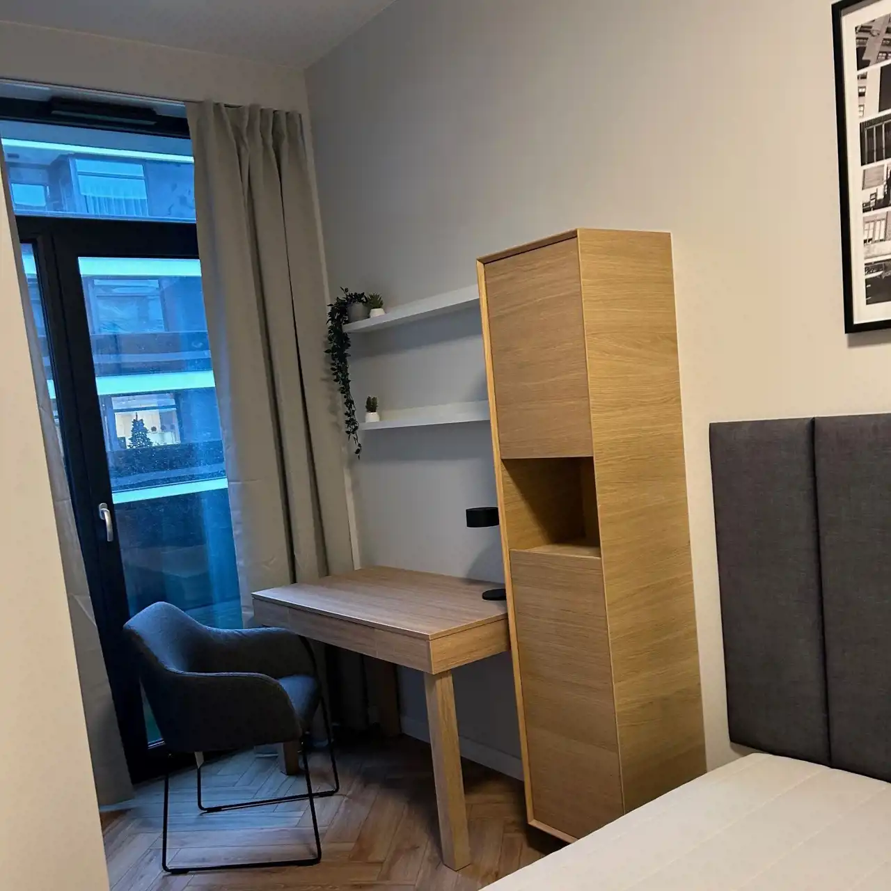 W sypialni łóżko dwuosobowe, biurko, pojemna szafa. Łazienka wyjątkowo duża i przestronna, z szerokimi drzwiami.