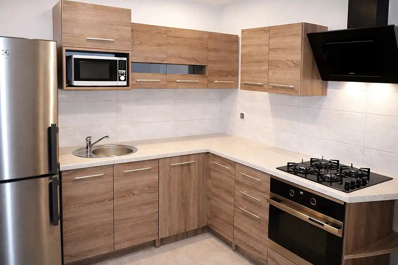 przestronna kuchnia wyposażona w: zmywarkę, płytę gazową, lodówkę, kuchenkę mikrofalową oraz piekarnik elektryczny,