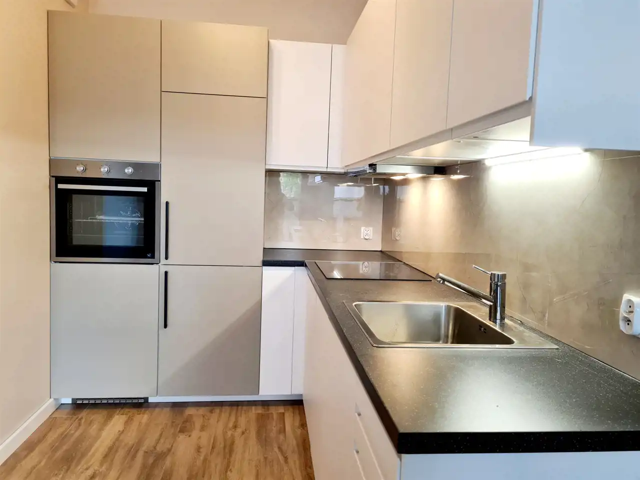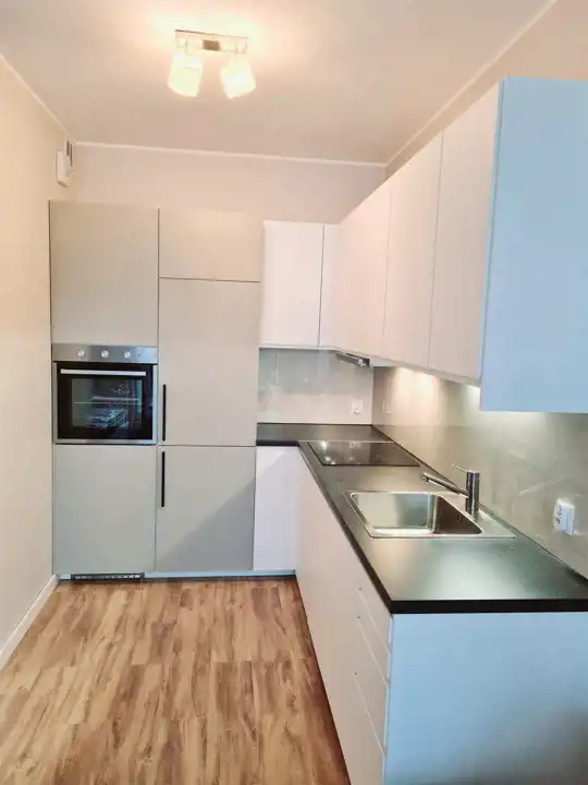 - aneks kuchenny ze stołem. Kuchnia wyposażona w sprzęty AGD ( płyta indukcyjna, piekarnik, zmywarka, lodówko-zamrażarka)