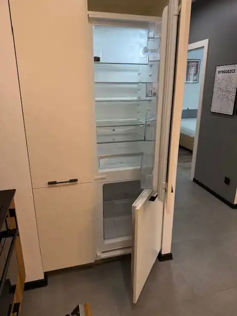 Aneks kuchenny w pełni wyposażony (zmywarka, piekarnik, płyta indukcyjna, lodówka, trochę naczyń).