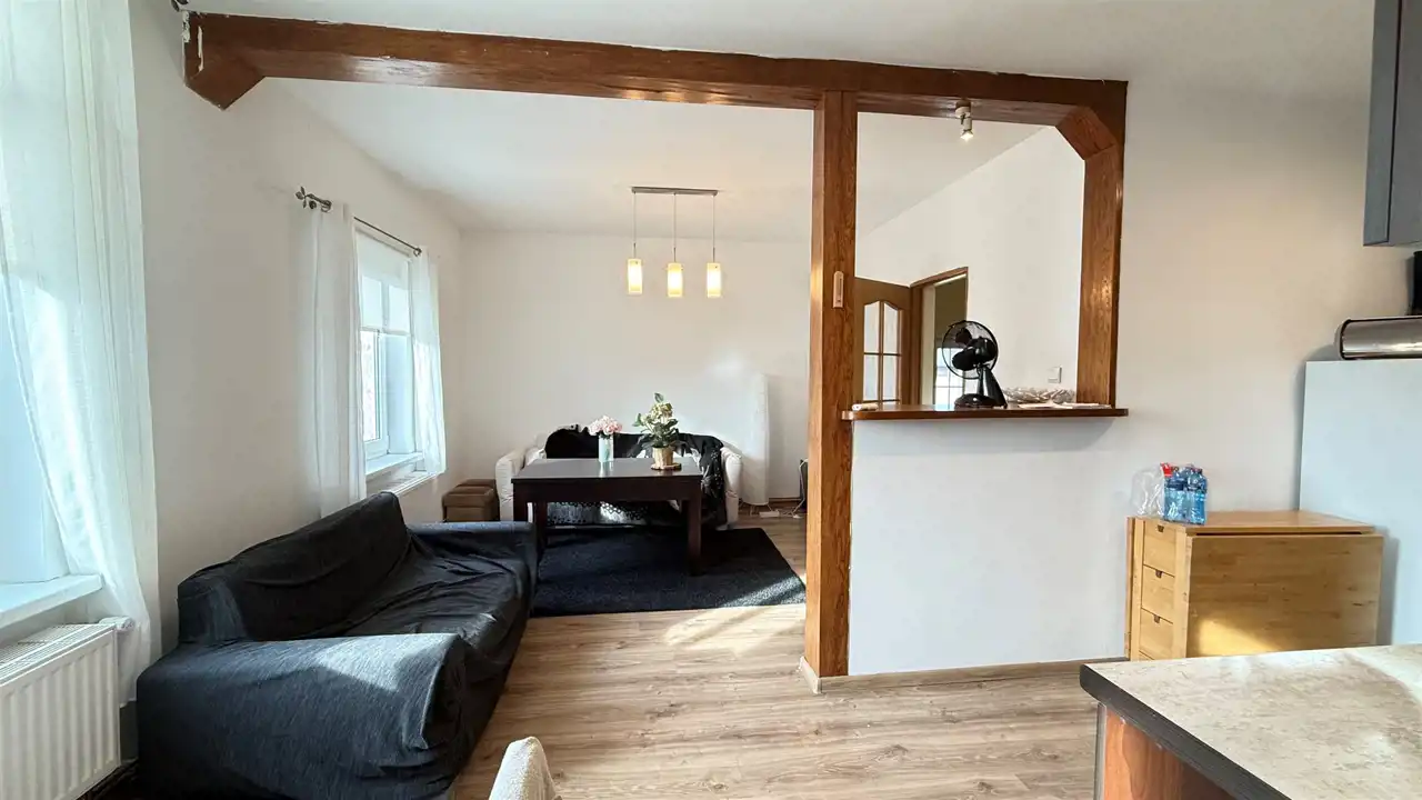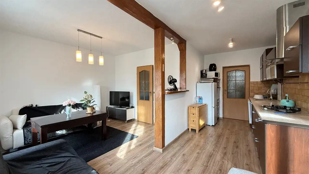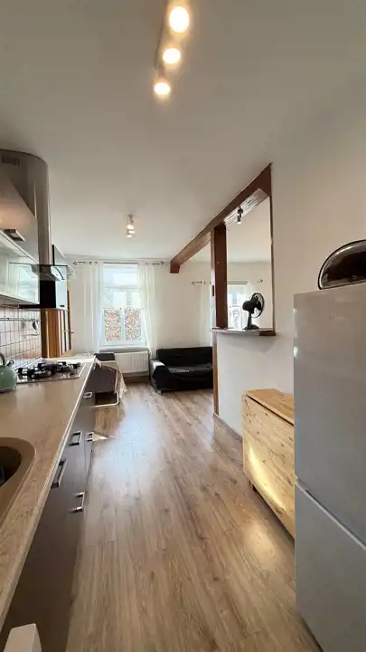 Mieszkanie kompletnie wyposażone. Przestronny aneks kuchenny ze sprzętem AGD (lodówka, zmywarka, piekarnik oraz mikrofala).
