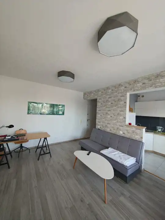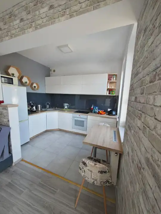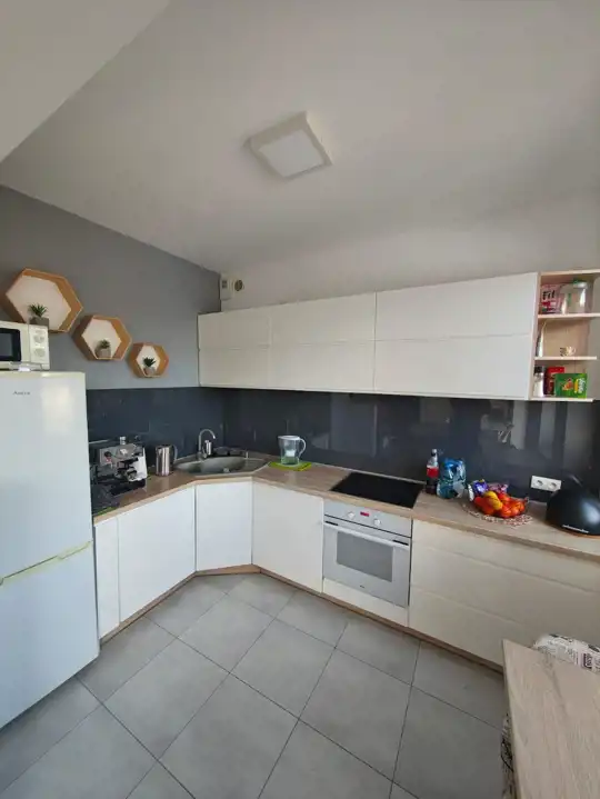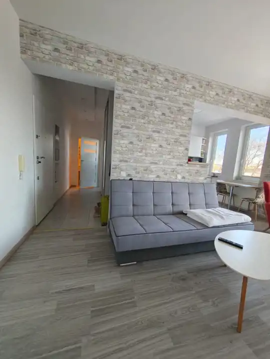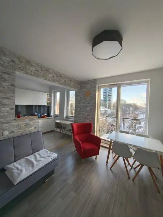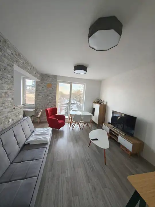 Przestronny, dobrze naświetlony pokój dzienny z aneksem kuchennym (kuchnia w zabudowie, lodówko-zamrażarka, piekarnik, płyta indukcyjna, zmywarka, stolik plus 2 krzesła), sofa rozkładana,stolik kawowy, stół plus 4 krzesła, komoda, szafka TV plus TV.