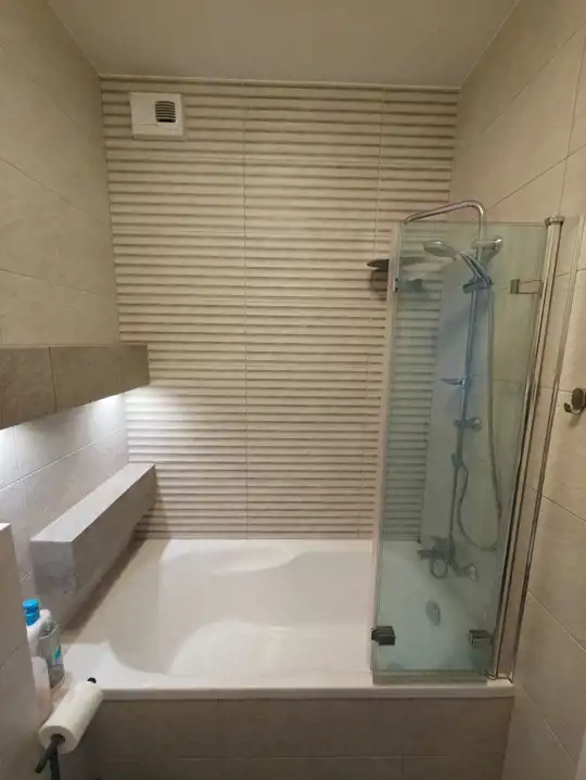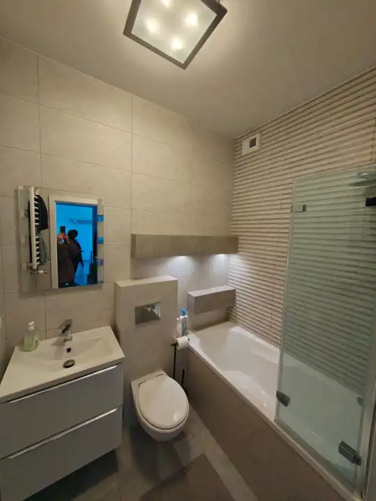 Łazienka z w.c w wysokim standardzie (nowoczesna glazura, terakota , wanna, panel prysznicowy, umywalka w zabudowie, lustro).